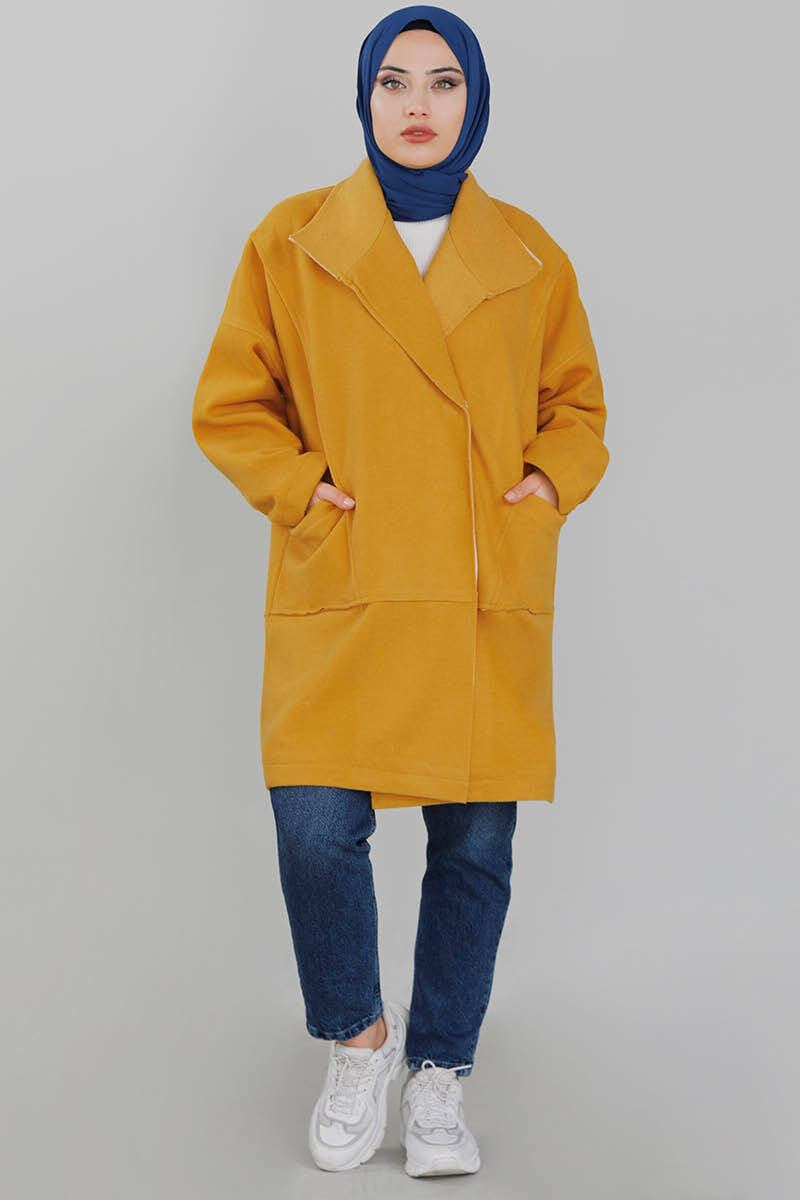 Dropped shoulders, double-breasted fastening with press-studs, side pockets, lining.