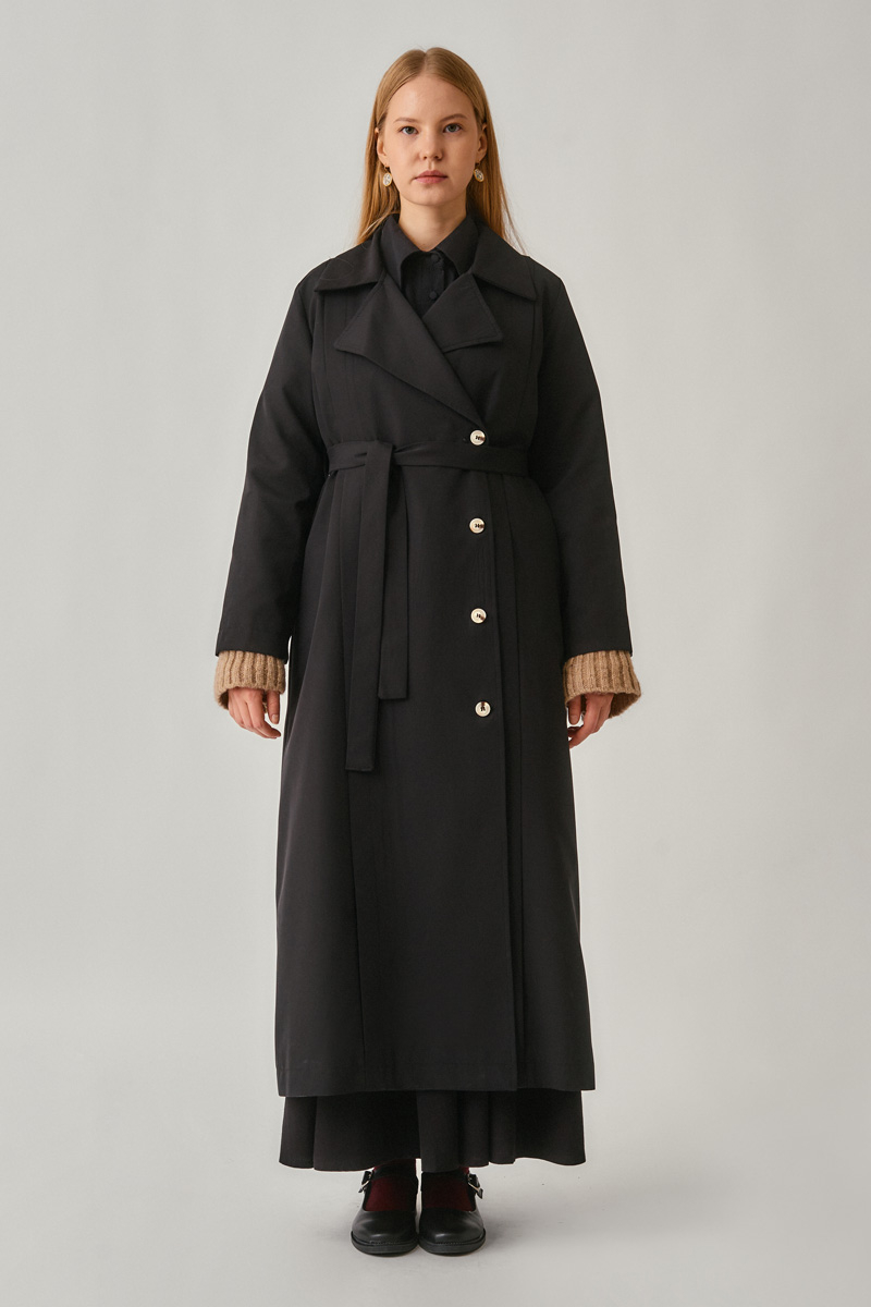 Striped Stitch Detail Trench Coat Black brings a modern touch to urban style with its simple and elegant silhouette. The belted waist detail adapts to your body shape while providing comfort throughout the day with its relaxed fit. Its minimal lines, stitched stripe accents, and double-breasted collar combine elegance with practicality, making it an ideal outerwear option for transitional seasons.