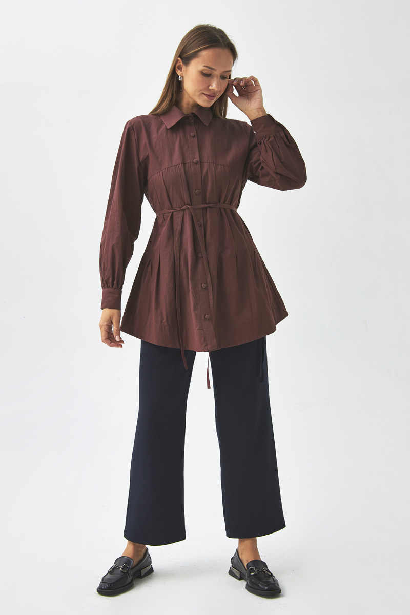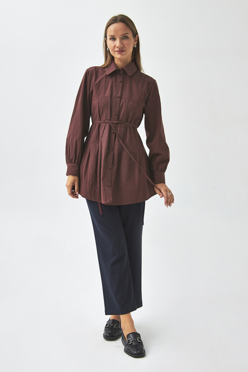 With its modern lines and elegant details, this shirt can be styled effortlessly for both casual and sophisticated outfits. The stitching details on the yoke add a dynamic touch to the design, while the slightly loose fit ensures all-day comfort. It pairs perfectly with trousers or skirts, making it a timeless wardrobe staple.