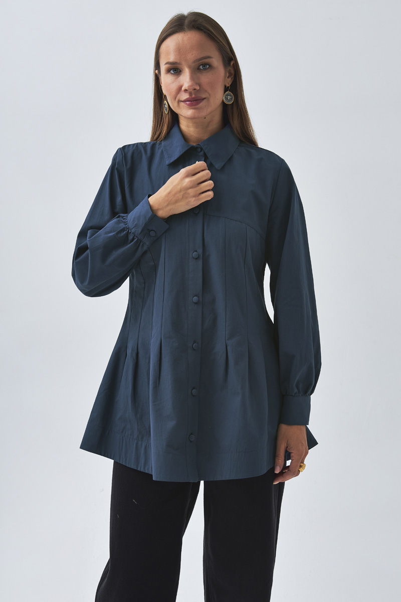 With its modern lines and elegant details, this shirt can be styled effortlessly for both casual and sophisticated outfits. The stitching details on the yoke add a dynamic touch to the design, while the slightly loose fit ensures all-day comfort. It pairs perfectly with trousers or skirts, making it a timeless wardrobe staple.