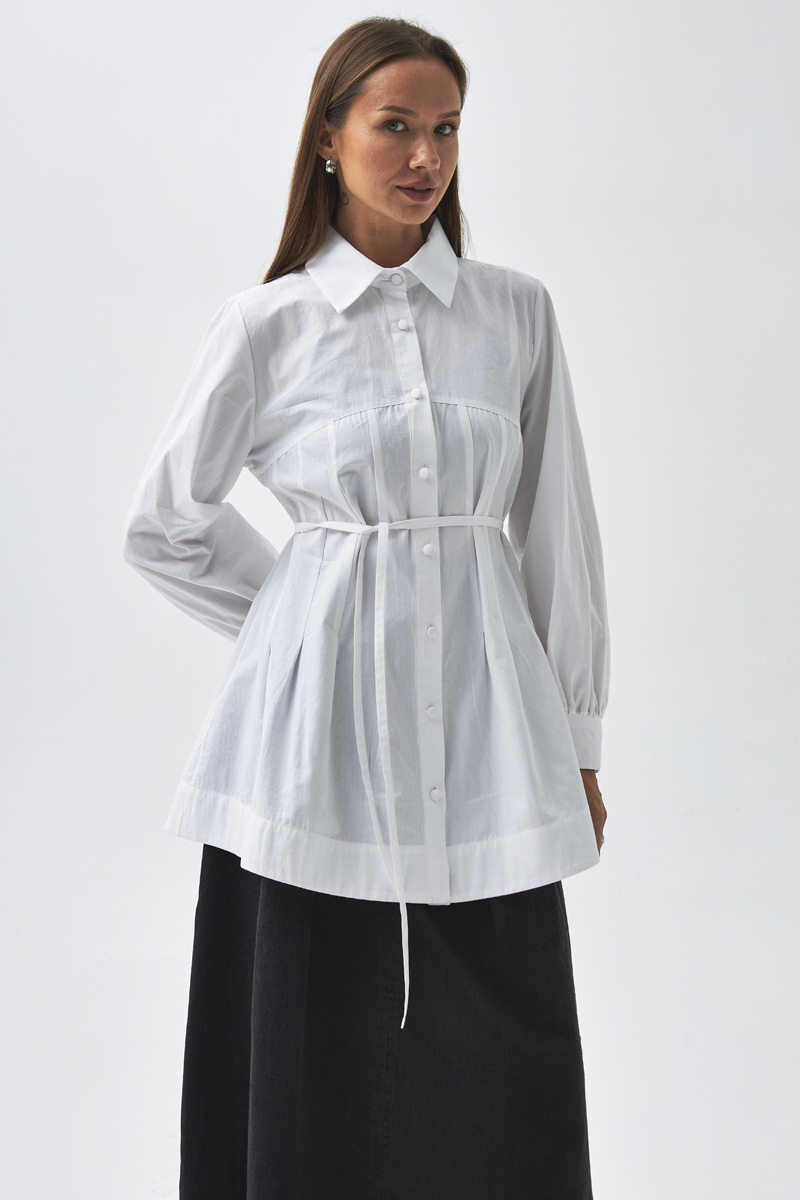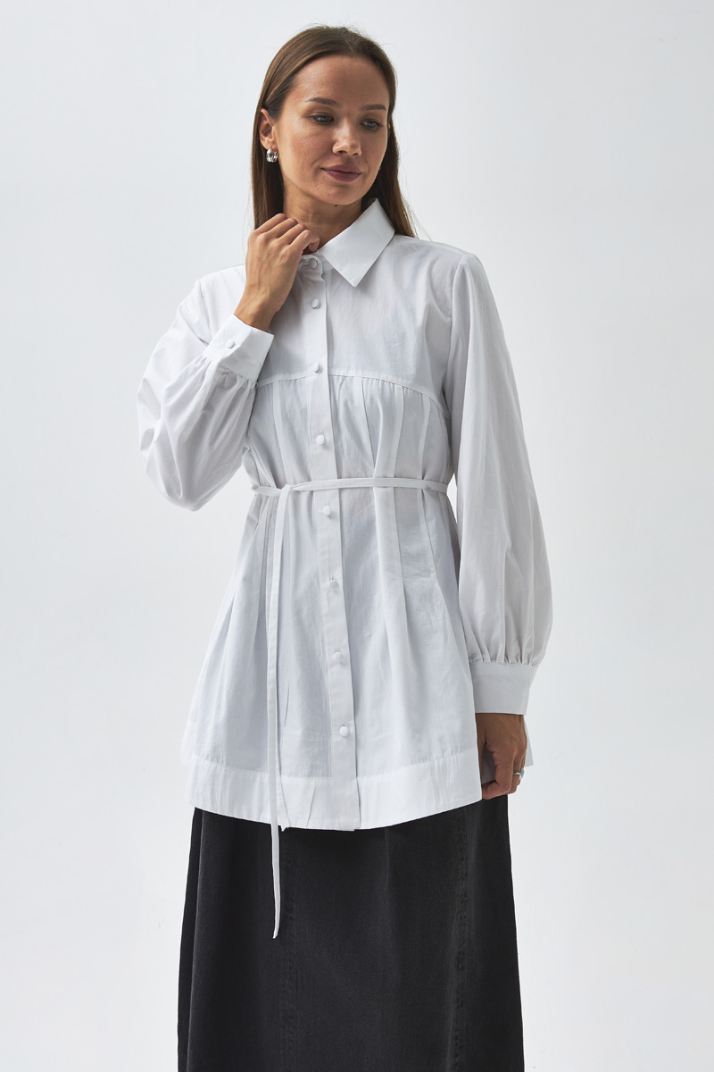 With its modern lines and elegant details, this shirt can be styled effortlessly for both casual and sophisticated outfits. The stitching details on the yoke add a dynamic touch to the design, while the slightly loose fit ensures all-day comfort. It pairs perfectly with trousers or skirts, making it a timeless wardrobe staple.