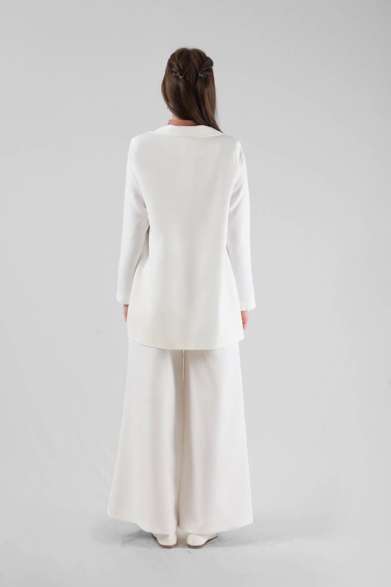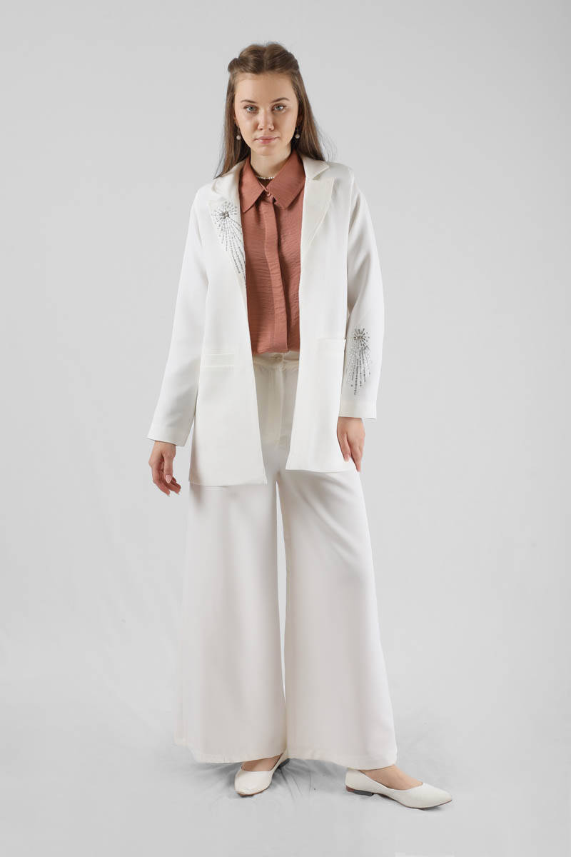 Stone Jacket Suit White. The jacket is lined. Collar and sleeve stone detail on the jacket. The trousers are elastic at the back, have pockets, have wide legs, are buttoned. You can choose it for your daily use and special occasions.