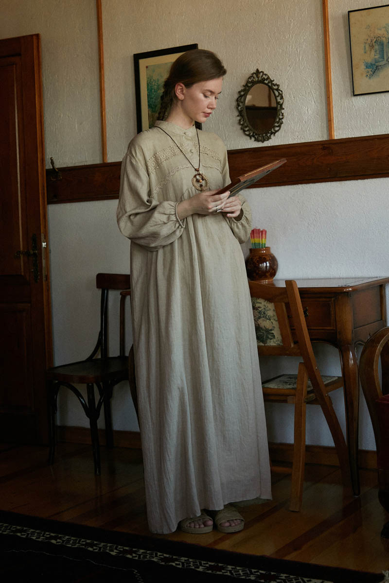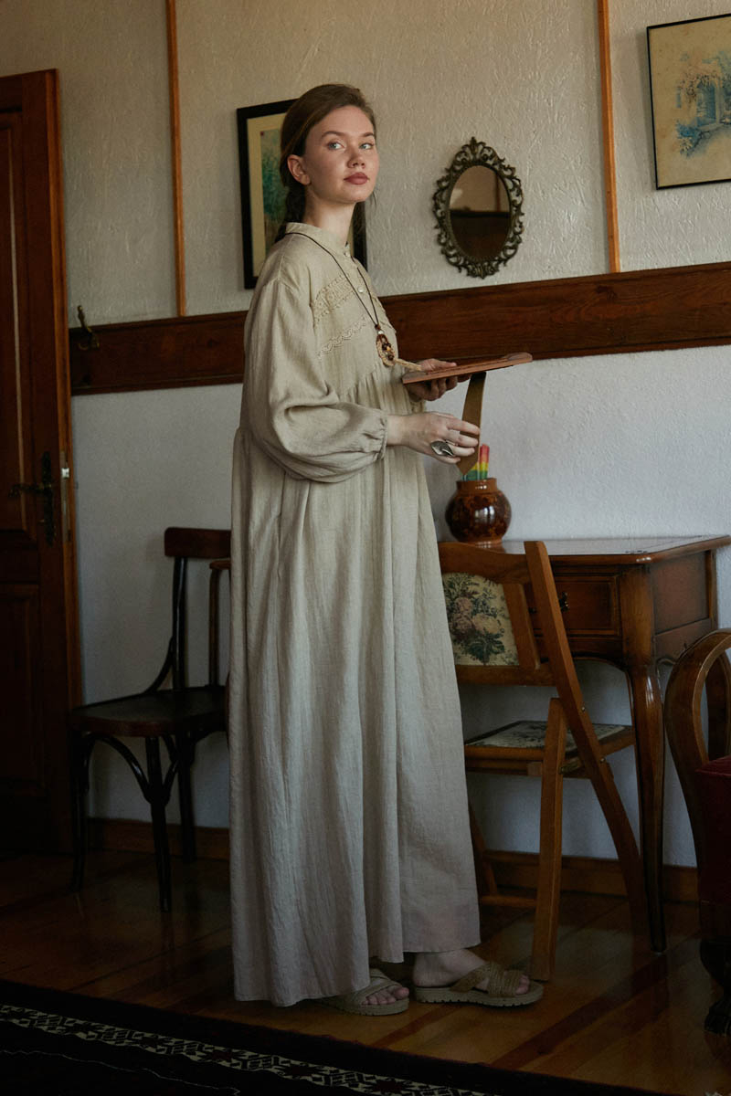 Offers a natural and timeless elegance, while its lightweight and breathable fabric ensures comfortable wear from summer through autumn. The lace details on the chest and pleated silhouette add a romantic, vintage touch, while its loose fit allows freedom of movement. With long sleeves featuring wide cuffs, it can be effortlessly styled for both casual and special occasions.