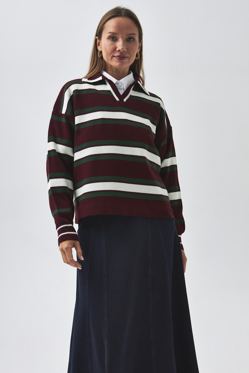 With its modern and dynamic design, this sweater brings an energetic touch to your everyday style. The polo collar and brown–baby blue striped pattern offer a subtle retro vibe, while the relaxed fit ensures all-day comfort. A versatile piece that can easily transition from office wear to casual outfits.