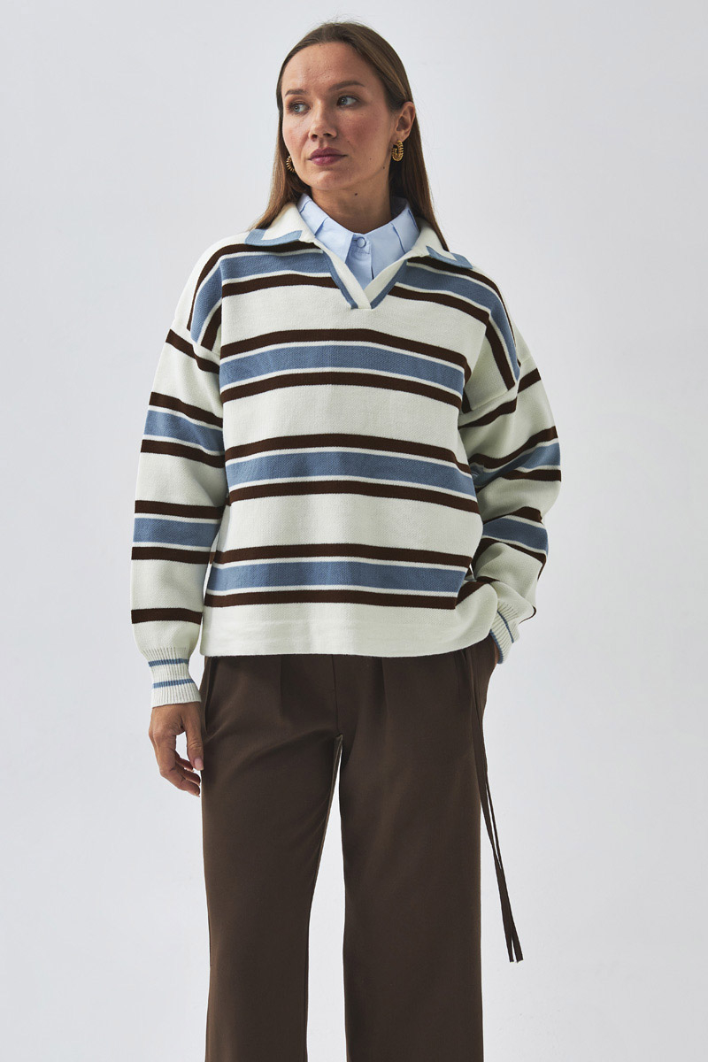 With its modern and dynamic design, this sweater brings an energetic touch to your everyday style. The polo collar and brown–baby blue striped pattern offer a subtle retro vibe, while the relaxed fit ensures all-day comfort. A versatile piece that can easily transition from office wear to casual outfits.