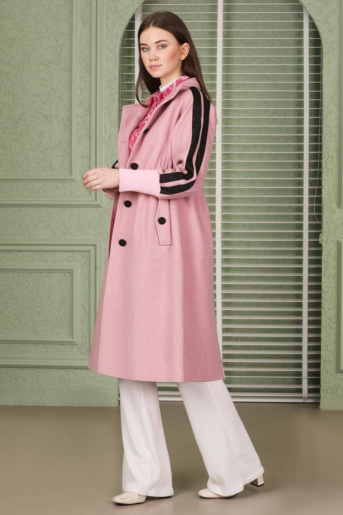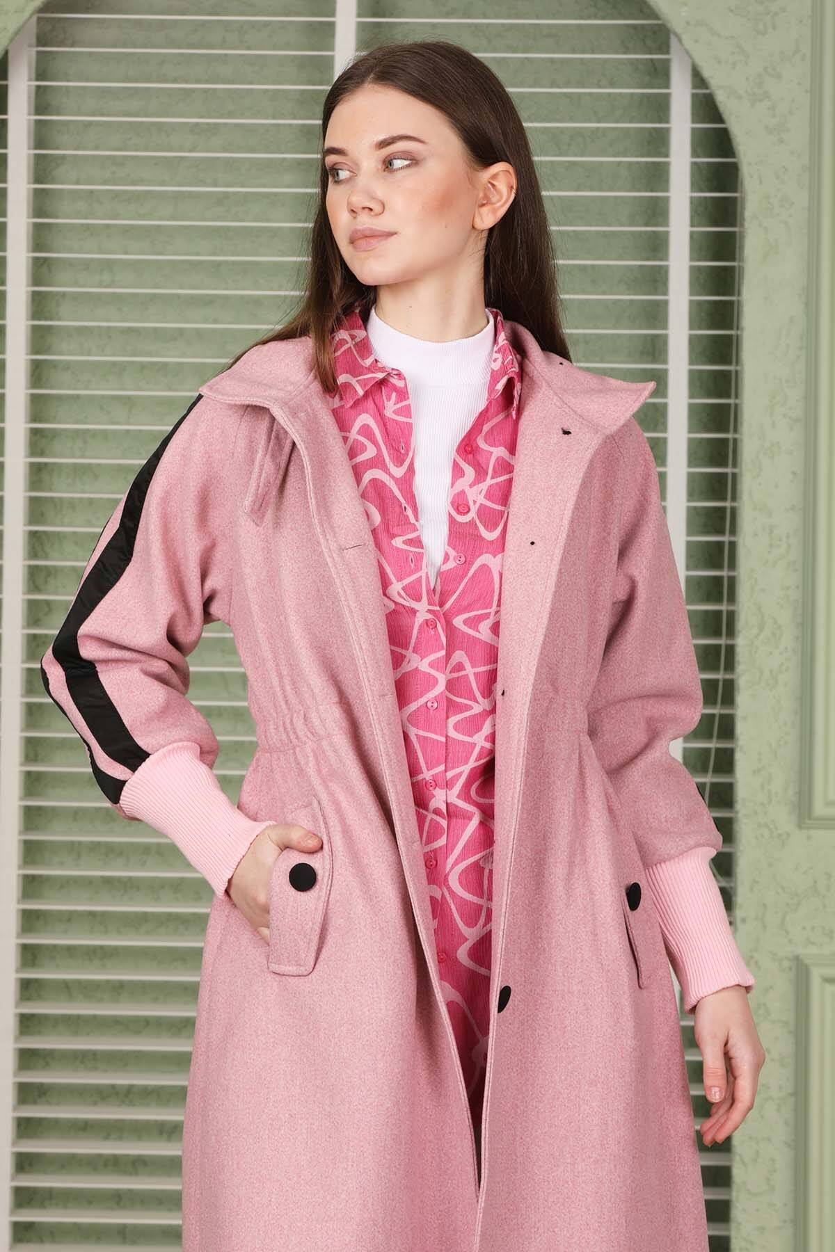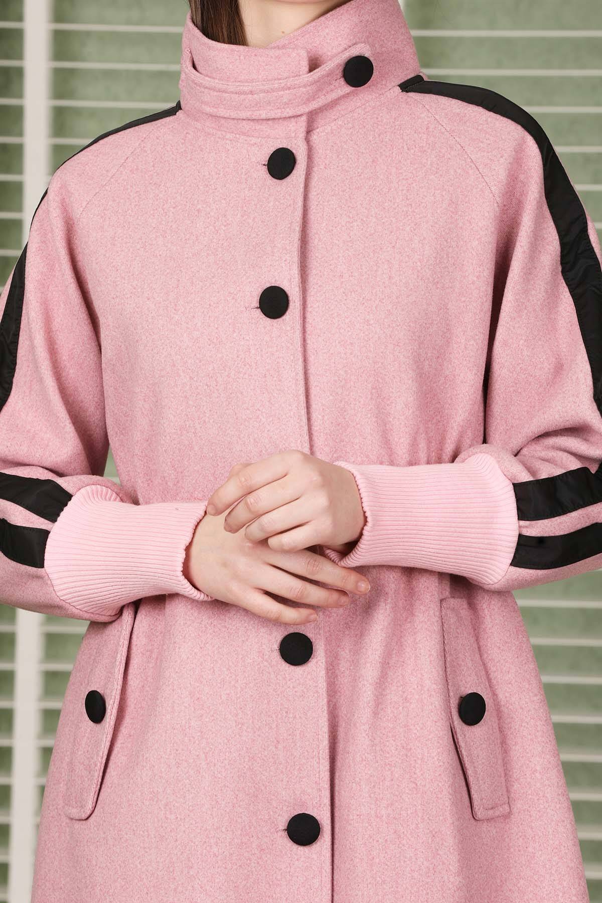 Striped Sleeves Cachet Coat Pink. Button front. Dog collar. The sleeve cuffs are ribbed. Side pockets. Lined.