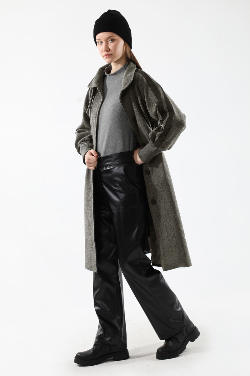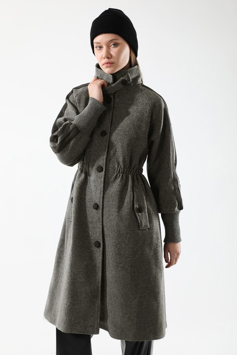 Striped Sleeves Cachet Coat Smoked. Button front. Dog collar. The sleeve cuffs are ribbed. Side pockets. Lined.