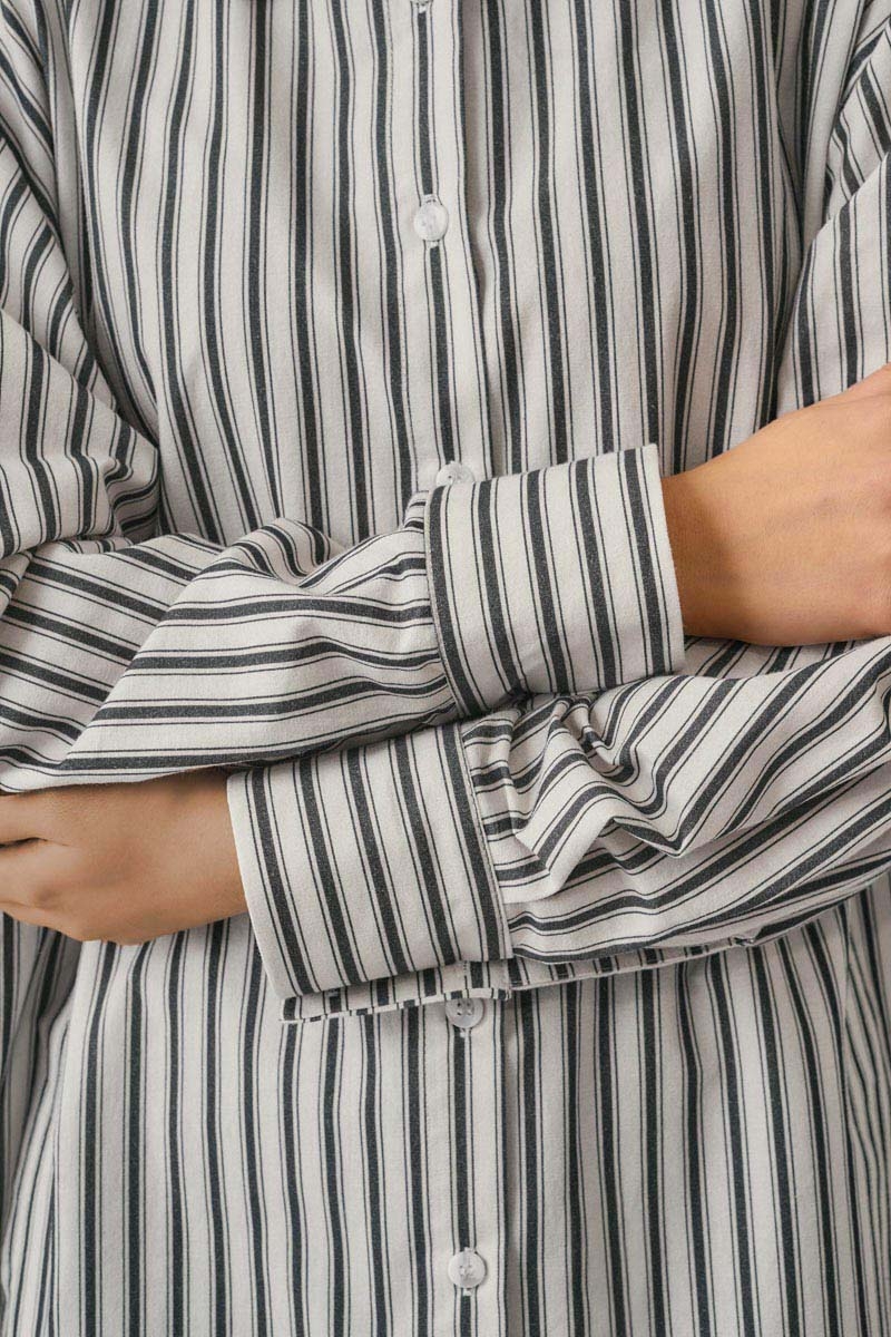 Striped Tunic Shirt Anthracite blends the classic striped pattern with a modern, relaxed cut. The soft-textured fabric and oversized silhouette offer all-day comfort. Dropped shoulders create an easy, effortless fit, while the button-down front adds a refined touch. Pair it with denim, knitwear, or tailored trousers for versatile styling—from daily city looks to weekend outfits.
