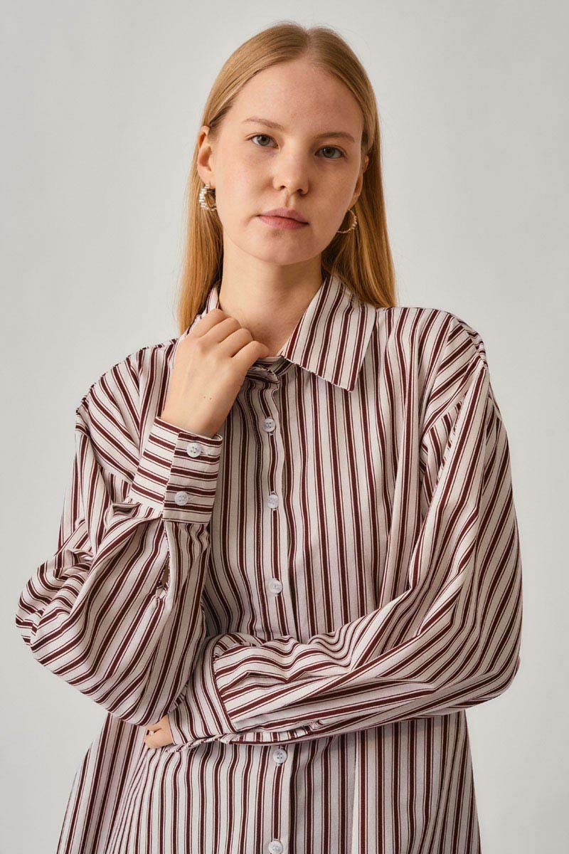 The Striped Tunic Shirt in Burgundy blends the classic striped pattern with a modern, relaxed cut. The soft-textured fabric and oversized silhouette offer all-day comfort. Dropped shoulders create an easy, effortless fit, while the button-down front adds a refined touch. Pair it with denim, knitwear, or tailored trousers for versatile styling—from daily city looks to weekend outfits.