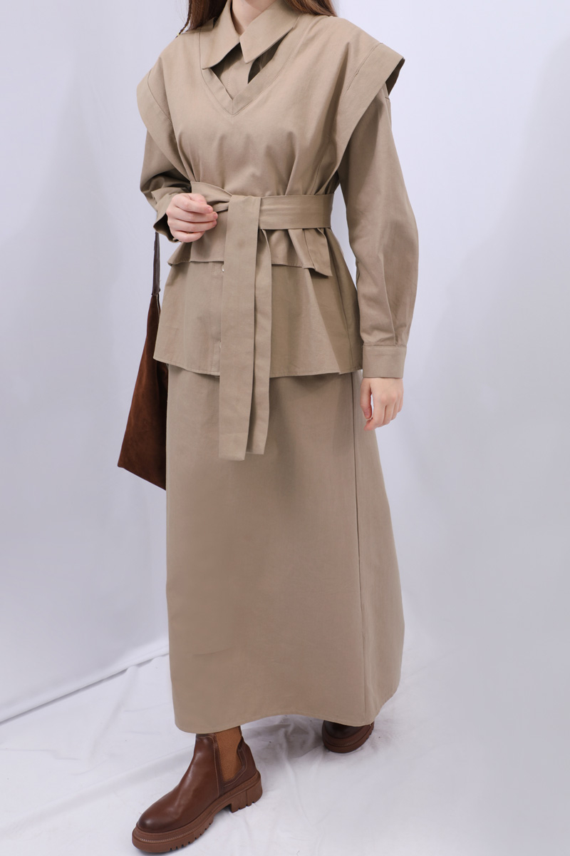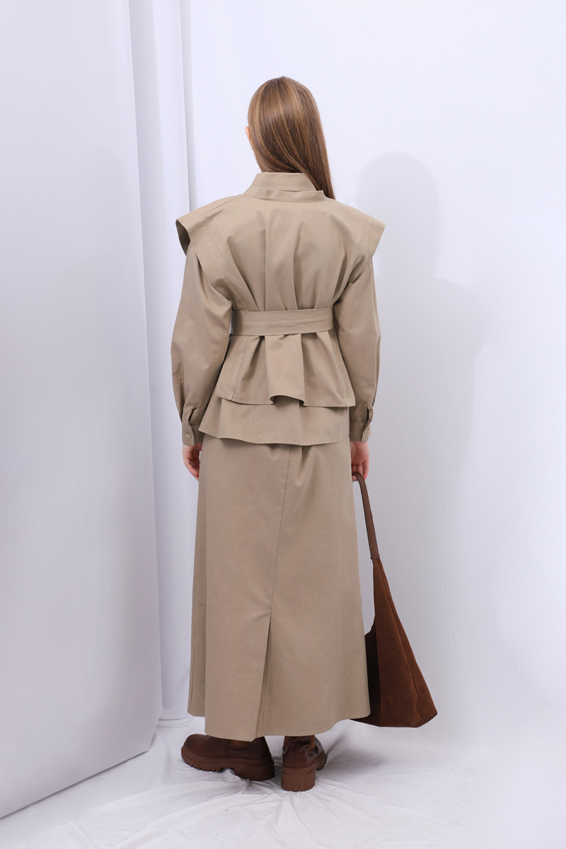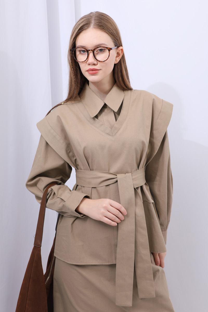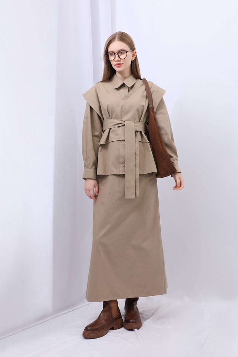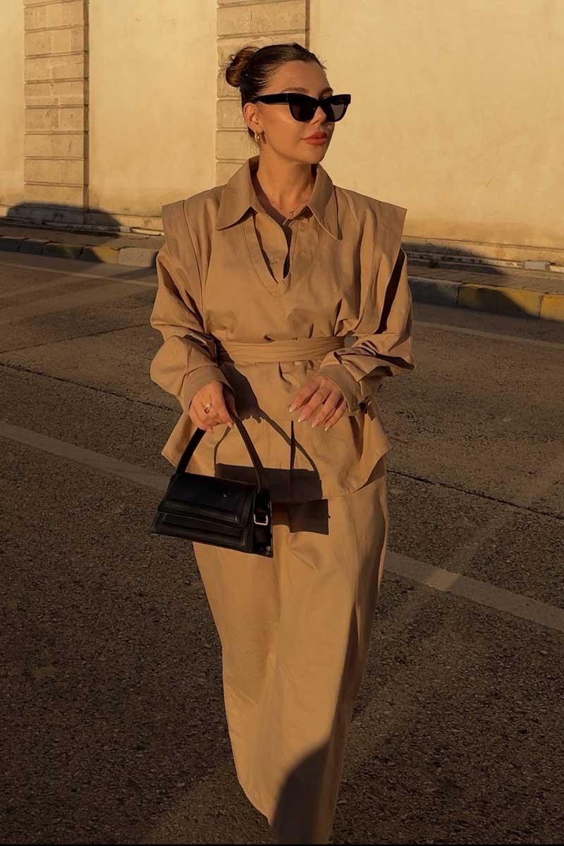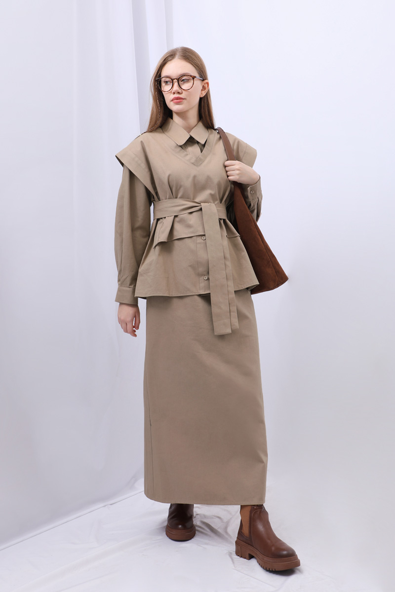 Yelekli Triko Takım Koyu Vizon. Gömlek sivri yakadır, düşük omuzludur, kolları manşetten pilelidir. Yelek, seyyar yelektir, V yakadır, kuşaklıdır. Etek arka bel lastikli ön bel büzgülüdür, yandan ceplidir, etek arkadan orta dikiş detaylı olup kapalı yırtmaç detaylıdır, astarsızdır. Günlük kullanım ve özel günlerinizde tercih edebilirsiniz.