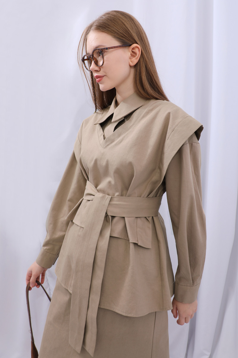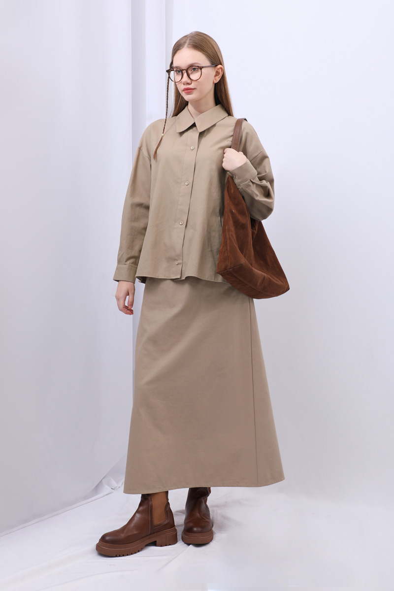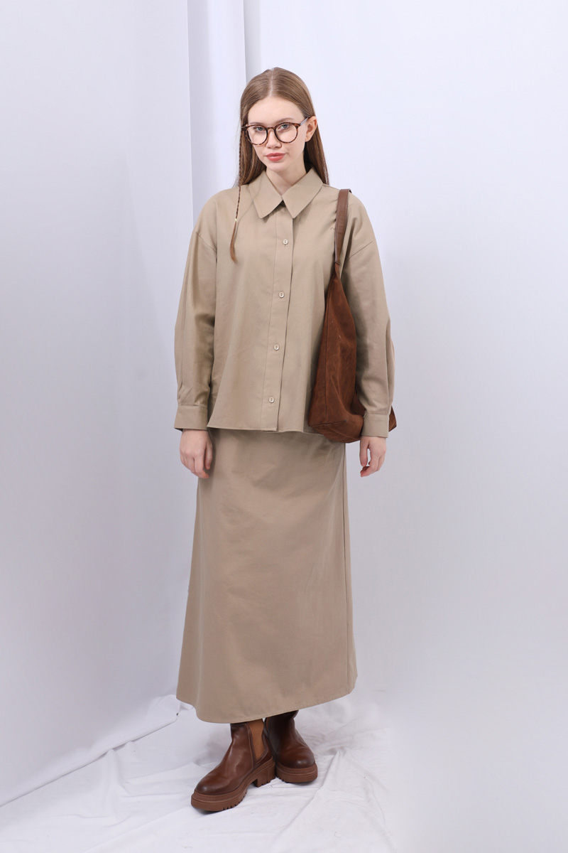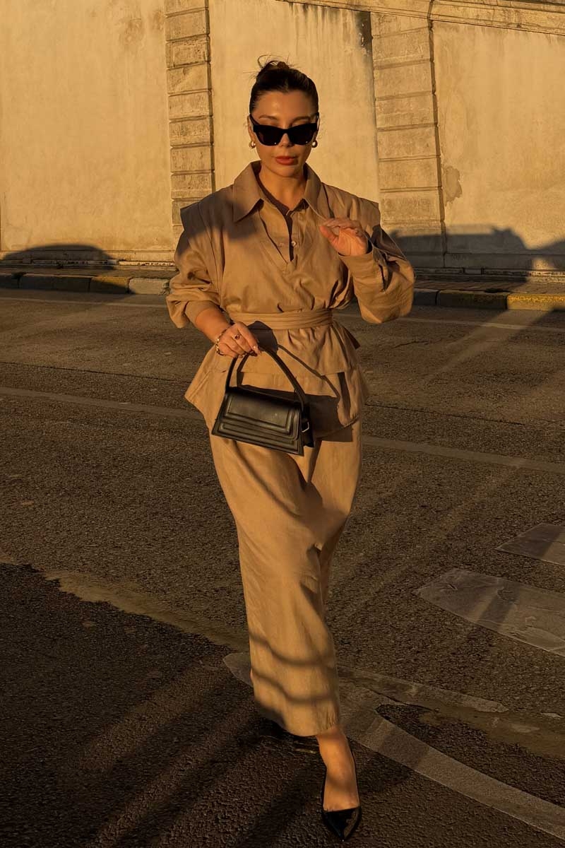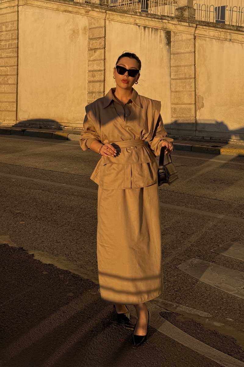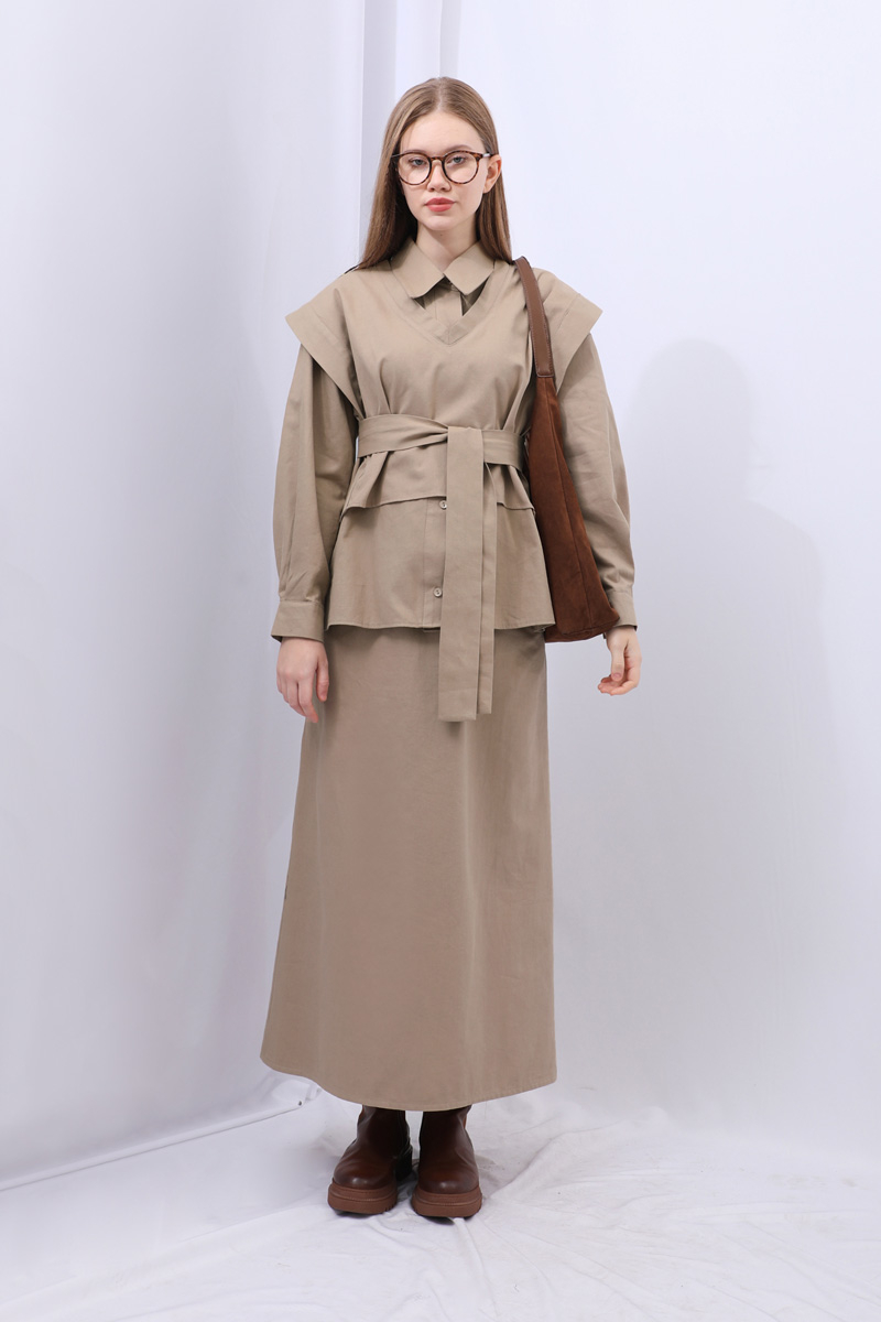 Yelekli Triko Takım Koyu Vizon. Gömlek sivri yakadır, düşük omuzludur, kolları manşetten pilelidir. Yelek, seyyar yelektir, V yakadır, kuşaklıdır. Etek arka bel lastikli ön bel büzgülüdür, yandan ceplidir, etek arkadan orta dikiş detaylı olup kapalı yırtmaç detaylıdır, astarsızdır. Günlük kullanım ve özel günlerinizde tercih edebilirsiniz.