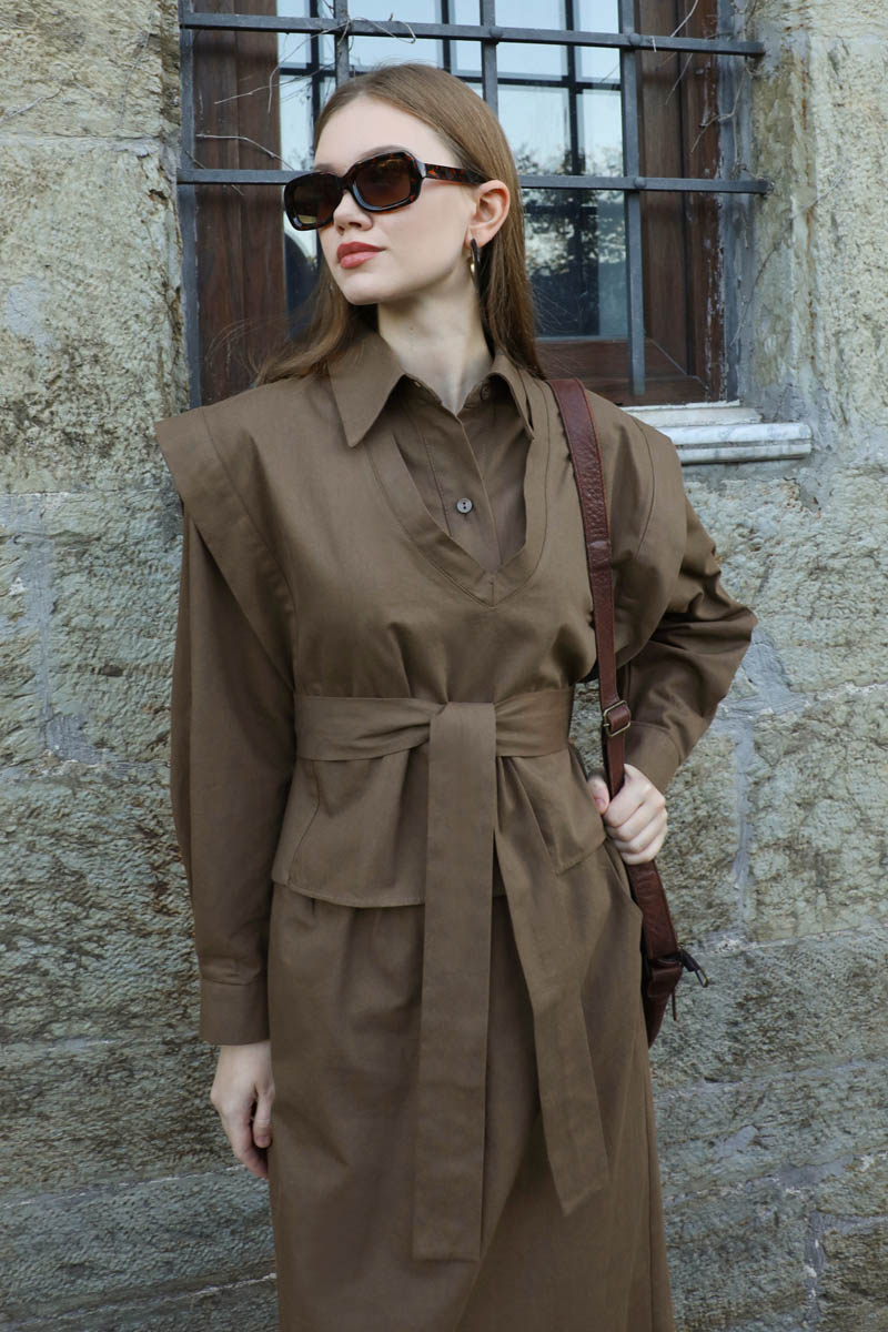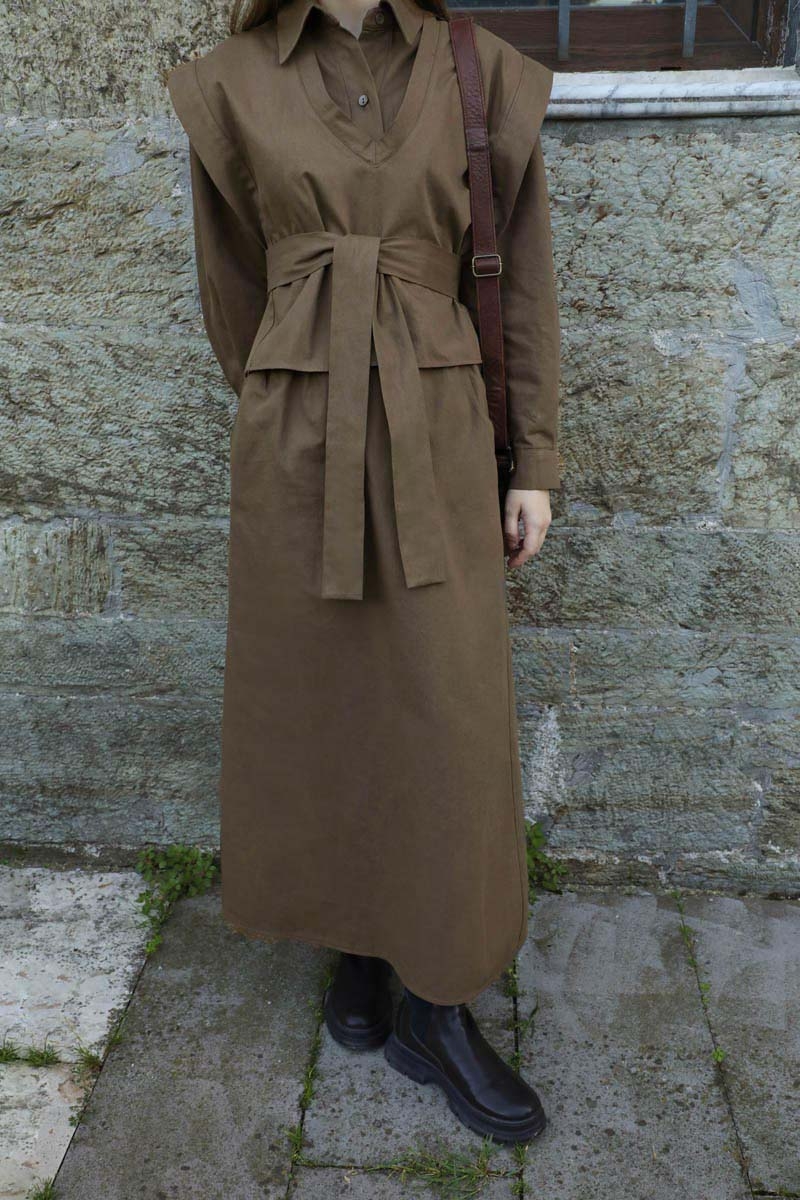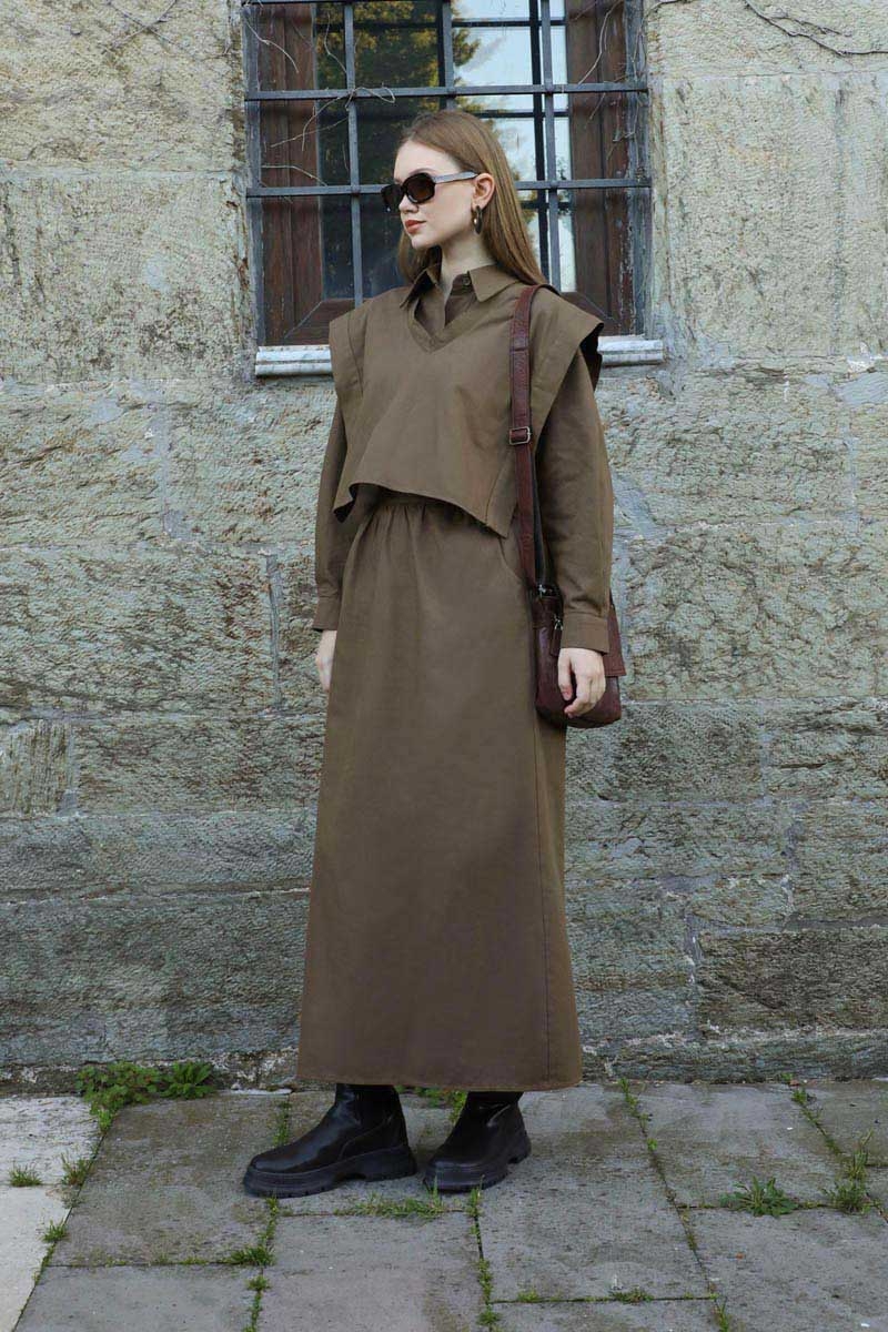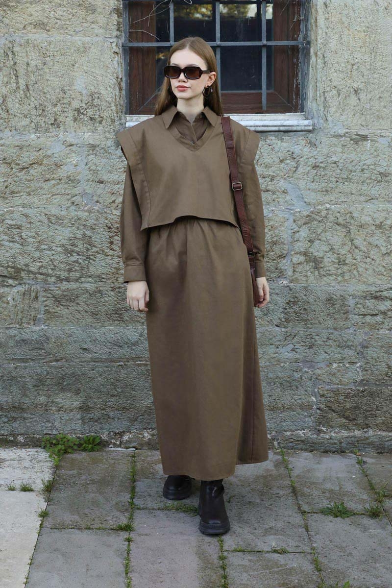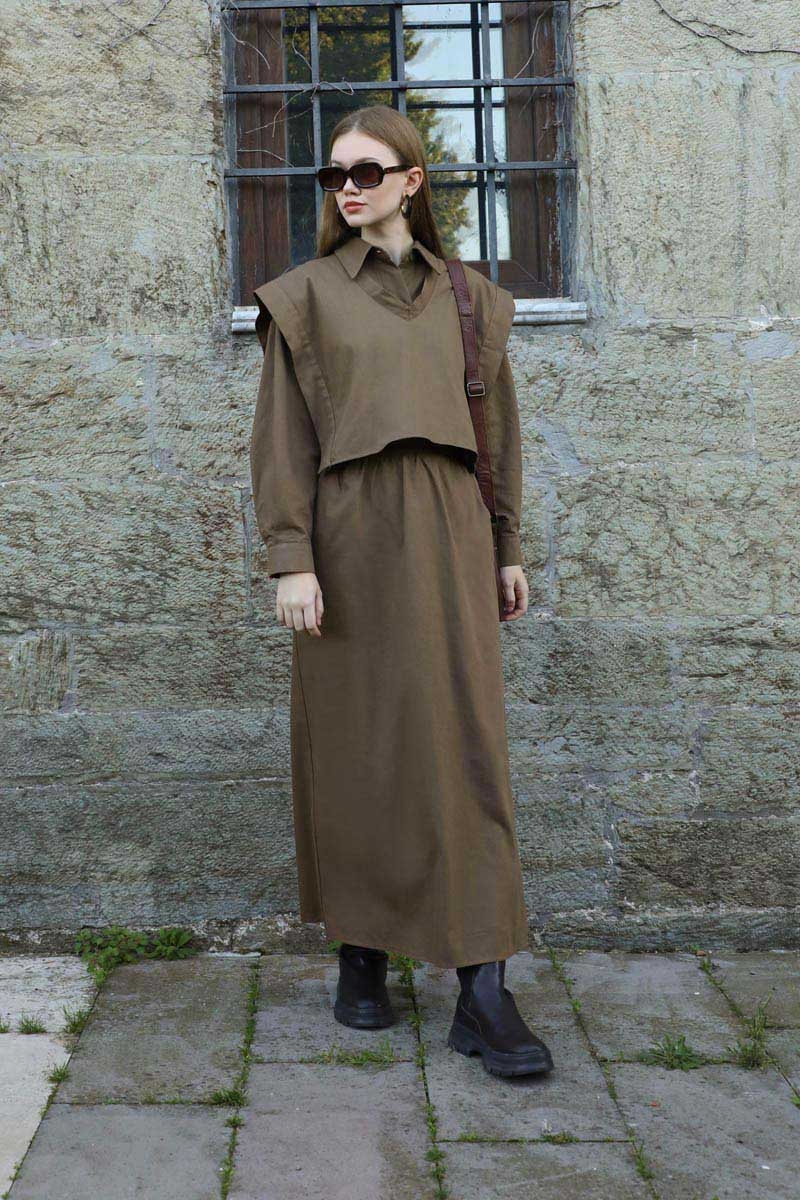 Yelekli Triko Takım Koyu Vizon. Gömlek sivri yakadır, düşük omuzludur, kolları manşetten pilelidir. Yelek, seyyar yelektir, V yakadır, kuşaklıdır. Etek arka bel lastikli ön bel büzgülüdür, yandan ceplidir, etek arkadan orta dikiş detaylı olup kapalı yırtmaç detaylıdır, astarsızdır. Günlük kullanım ve özel günlerinizde tercih edebilirsiniz.