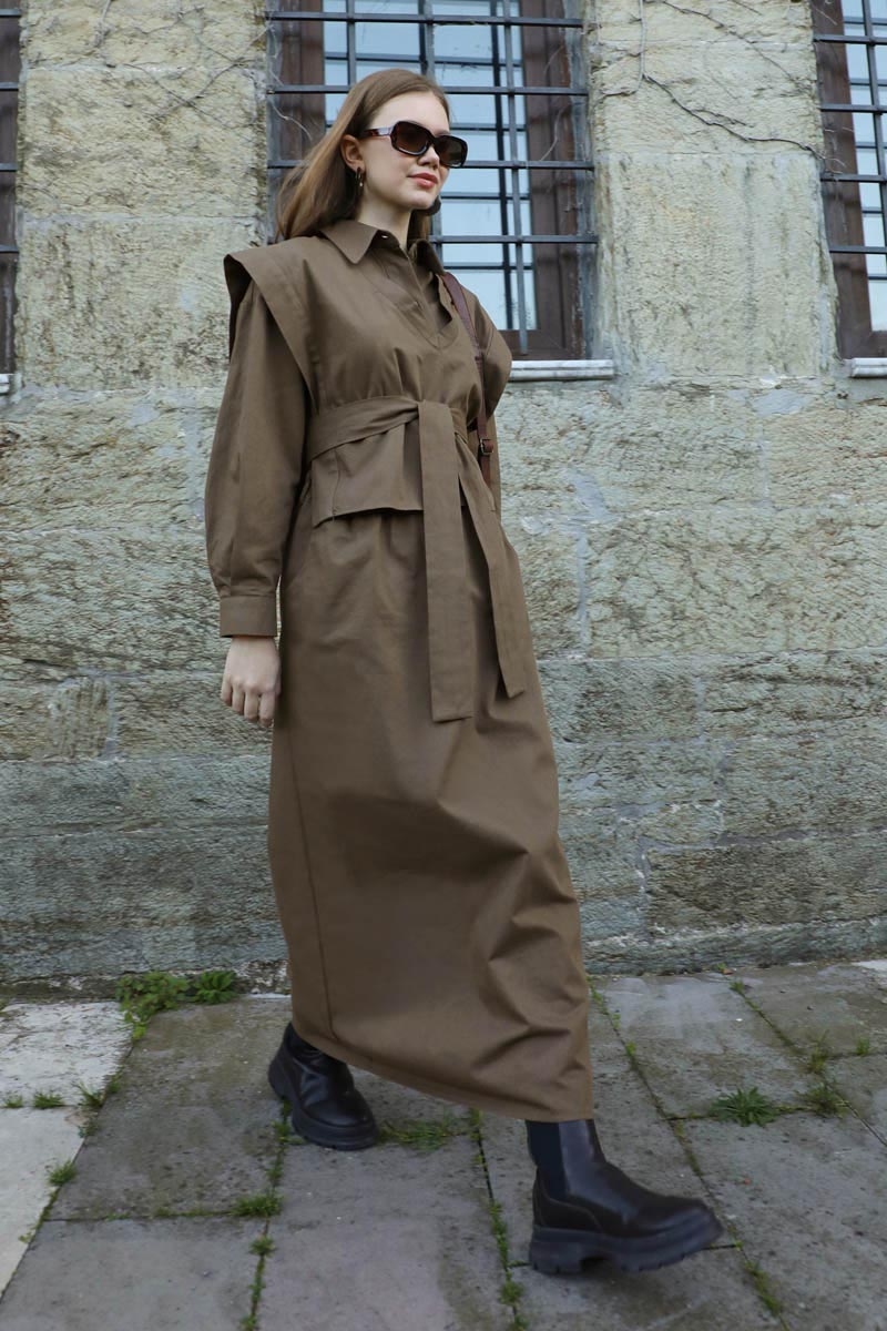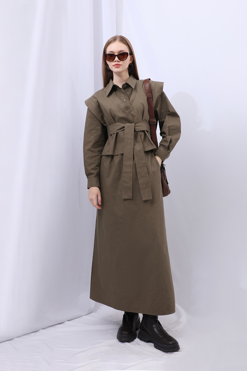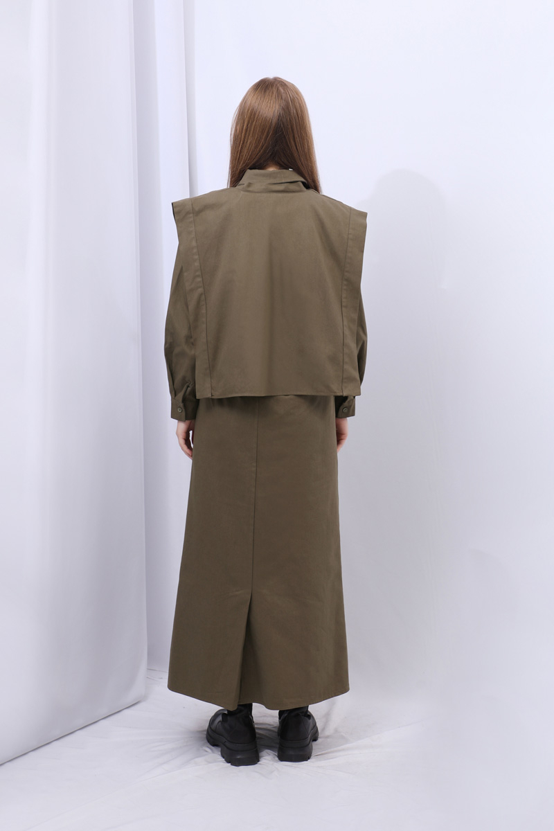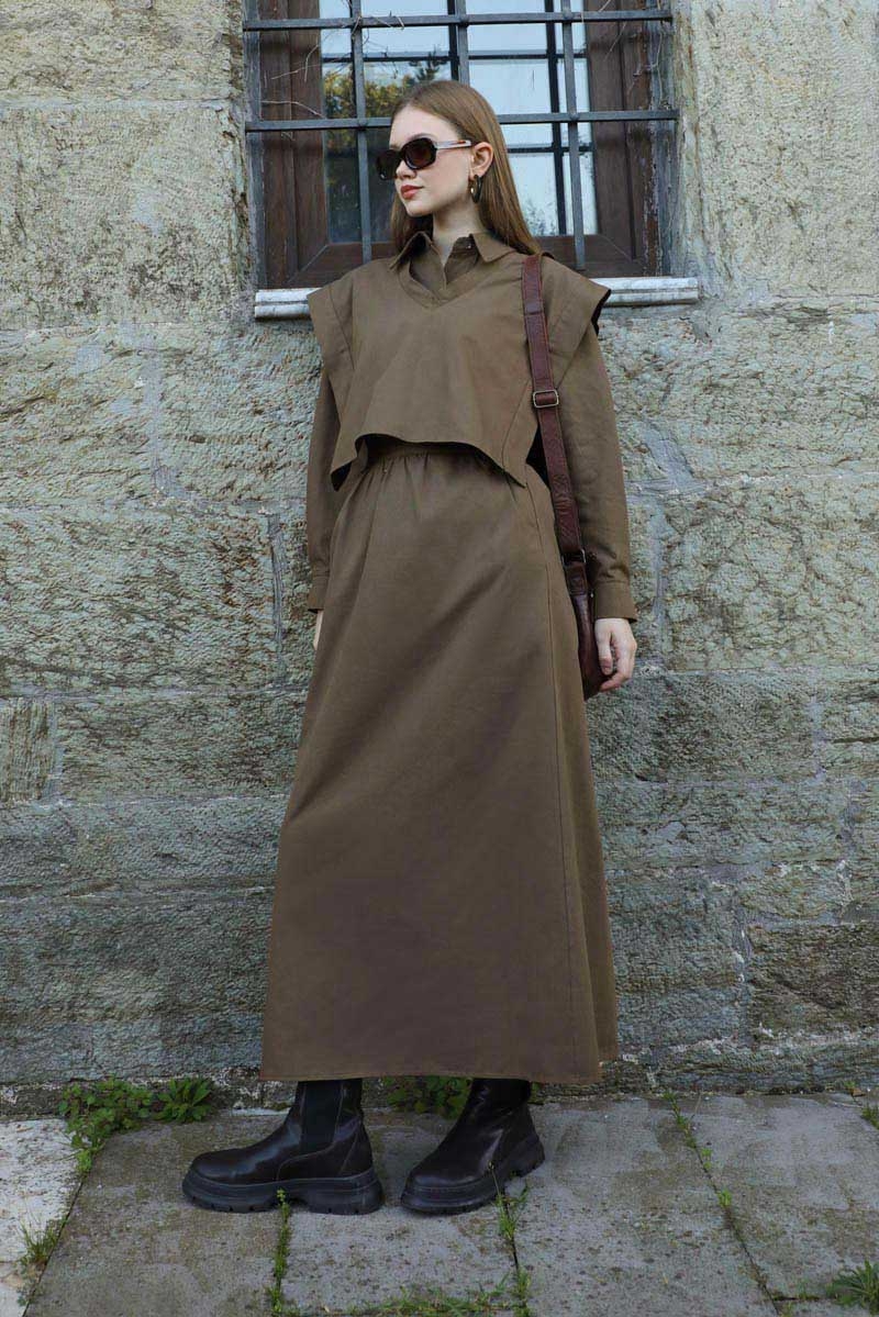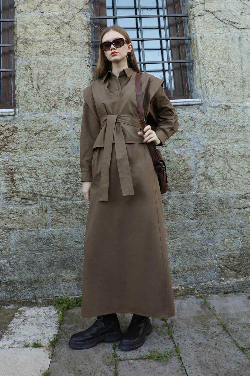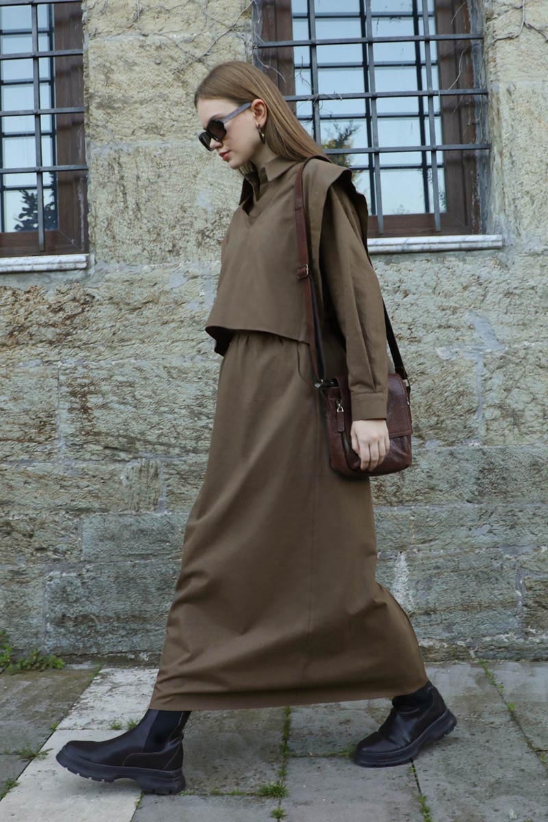 Yelekli Triko Takım Koyu Vizon. Gömlek sivri yakadır, düşük omuzludur, kolları manşetten pilelidir. Yelek, seyyar yelektir, V yakadır, kuşaklıdır. Etek arka bel lastikli ön bel büzgülüdür, yandan ceplidir, etek arkadan orta dikiş detaylı olup kapalı yırtmaç detaylıdır, astarsızdır. Günlük kullanım ve özel günlerinizde tercih edebilirsiniz.