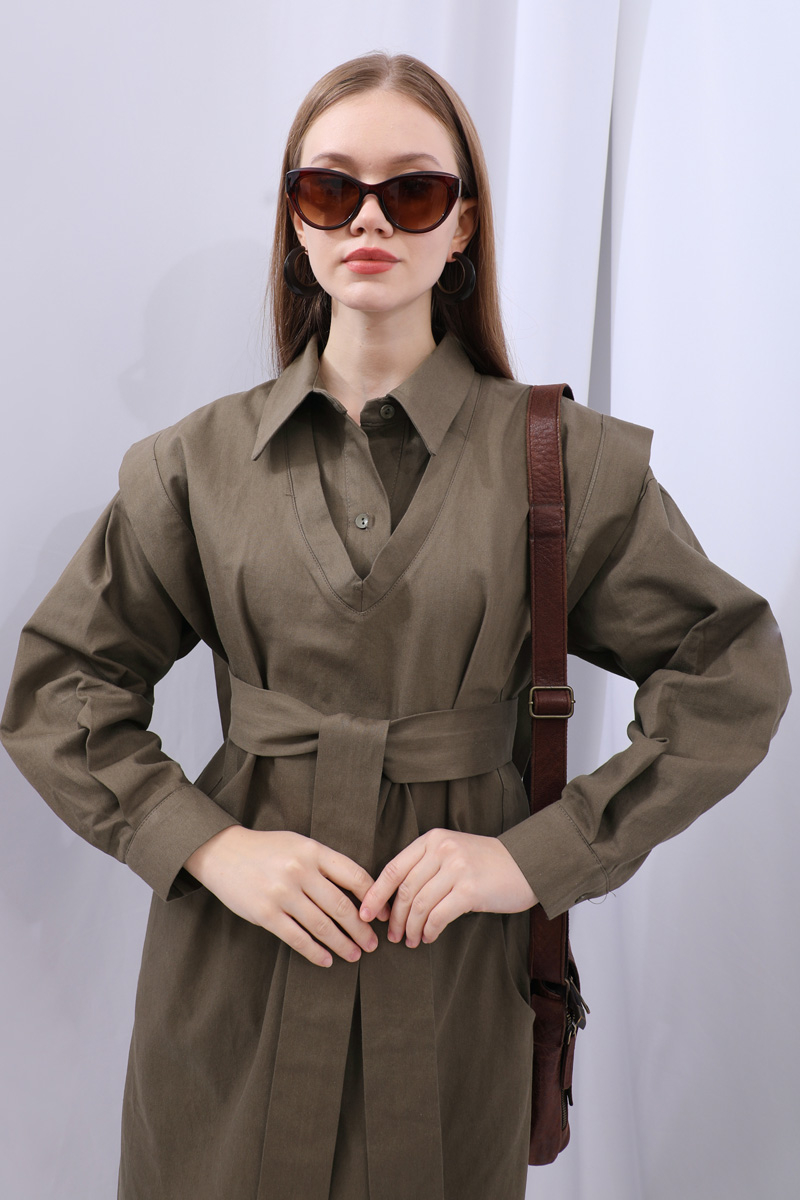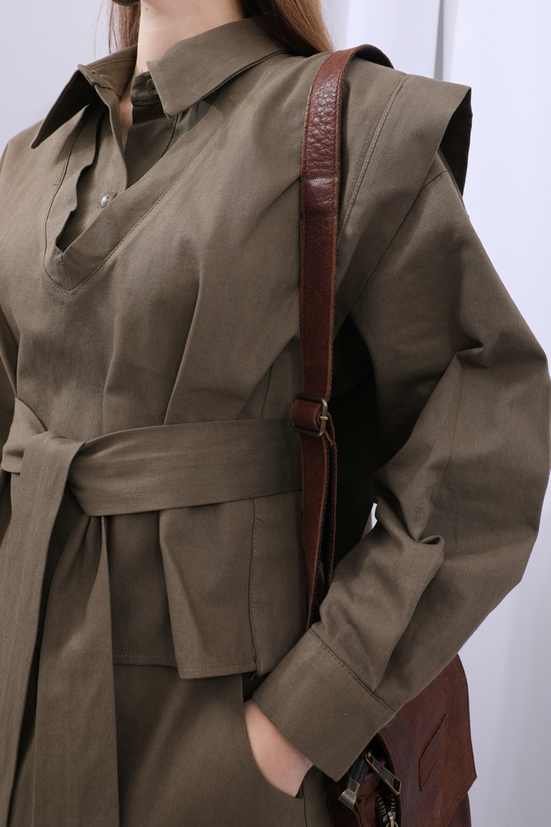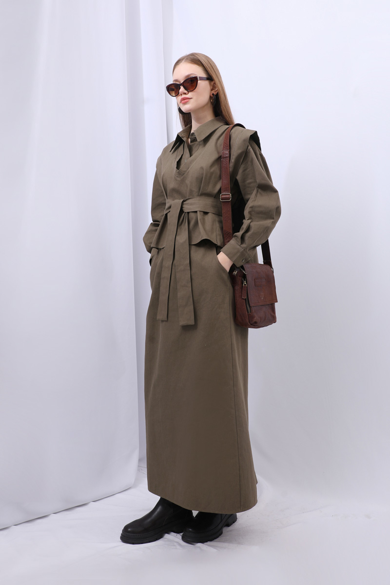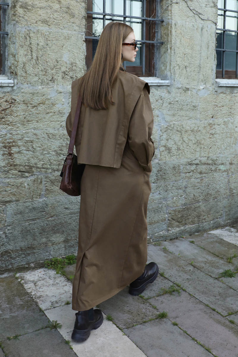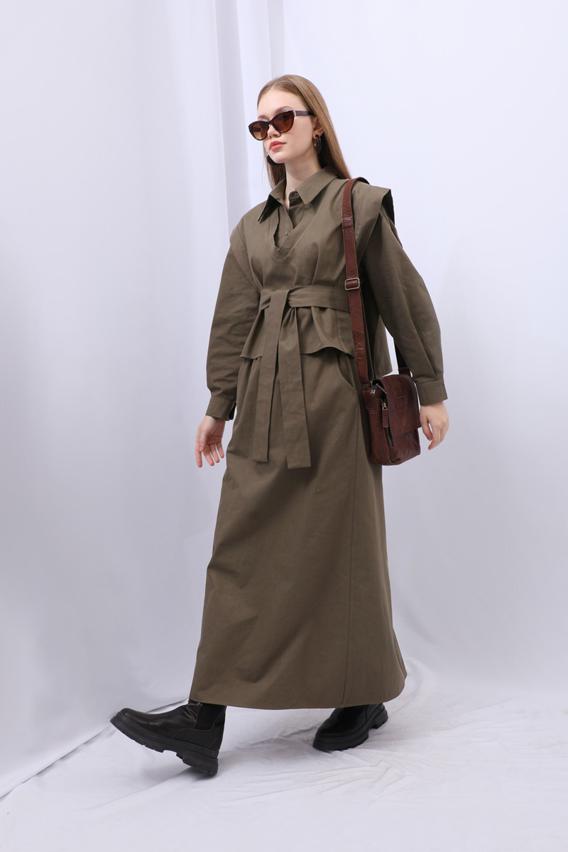 Yelekli Triko Takım Koyu Vizon. Gömlek sivri yakadır, düşük omuzludur, kolları manşetten pilelidir. Yelek, seyyar yelektir, V yakadır, kuşaklıdır. Etek arka bel lastikli ön bel büzgülüdür, yandan ceplidir, etek arkadan orta dikiş detaylı olup kapalı yırtmaç detaylıdır, astarsızdır. Günlük kullanım ve özel günlerinizde tercih edebilirsiniz.
