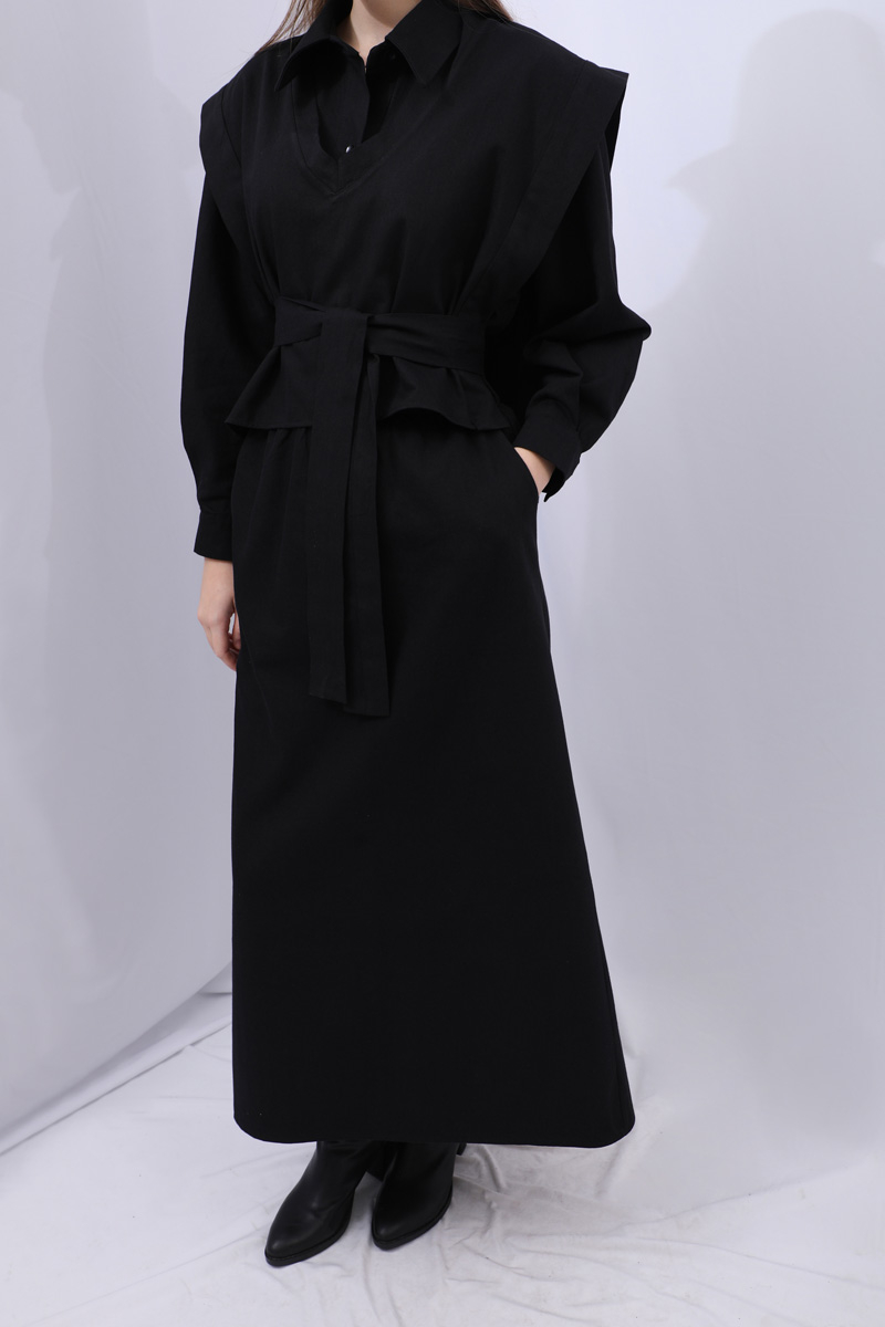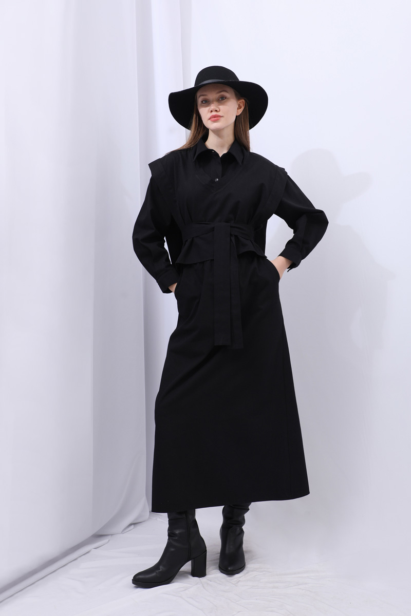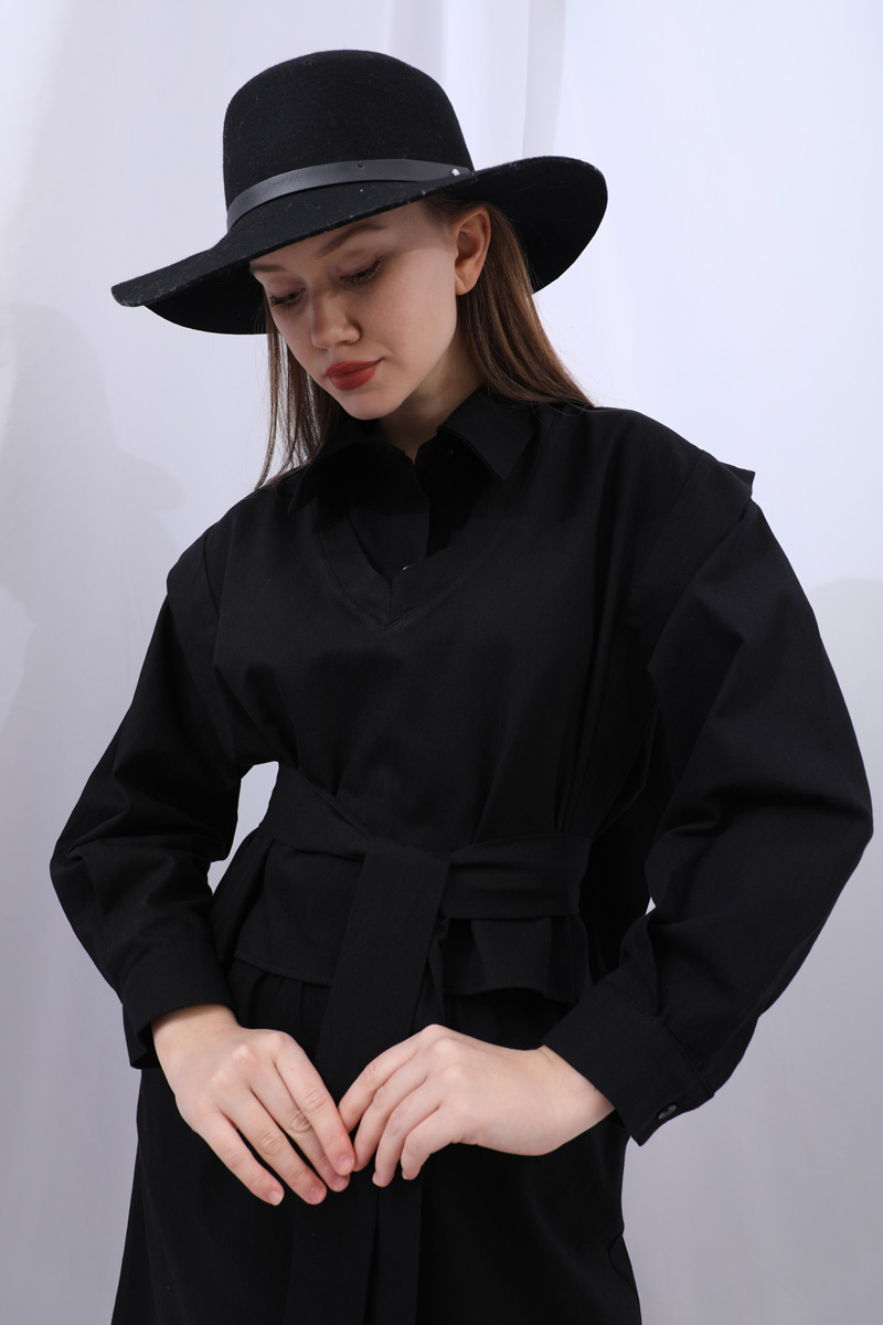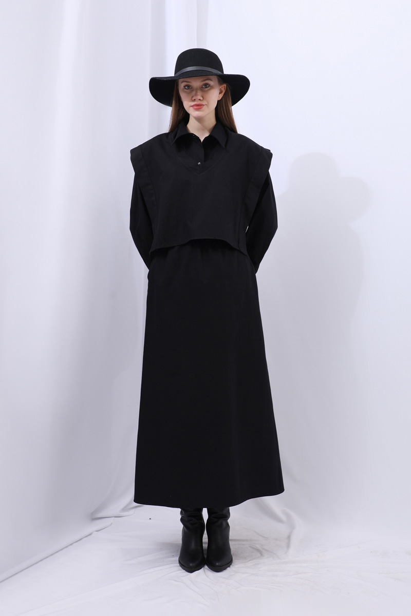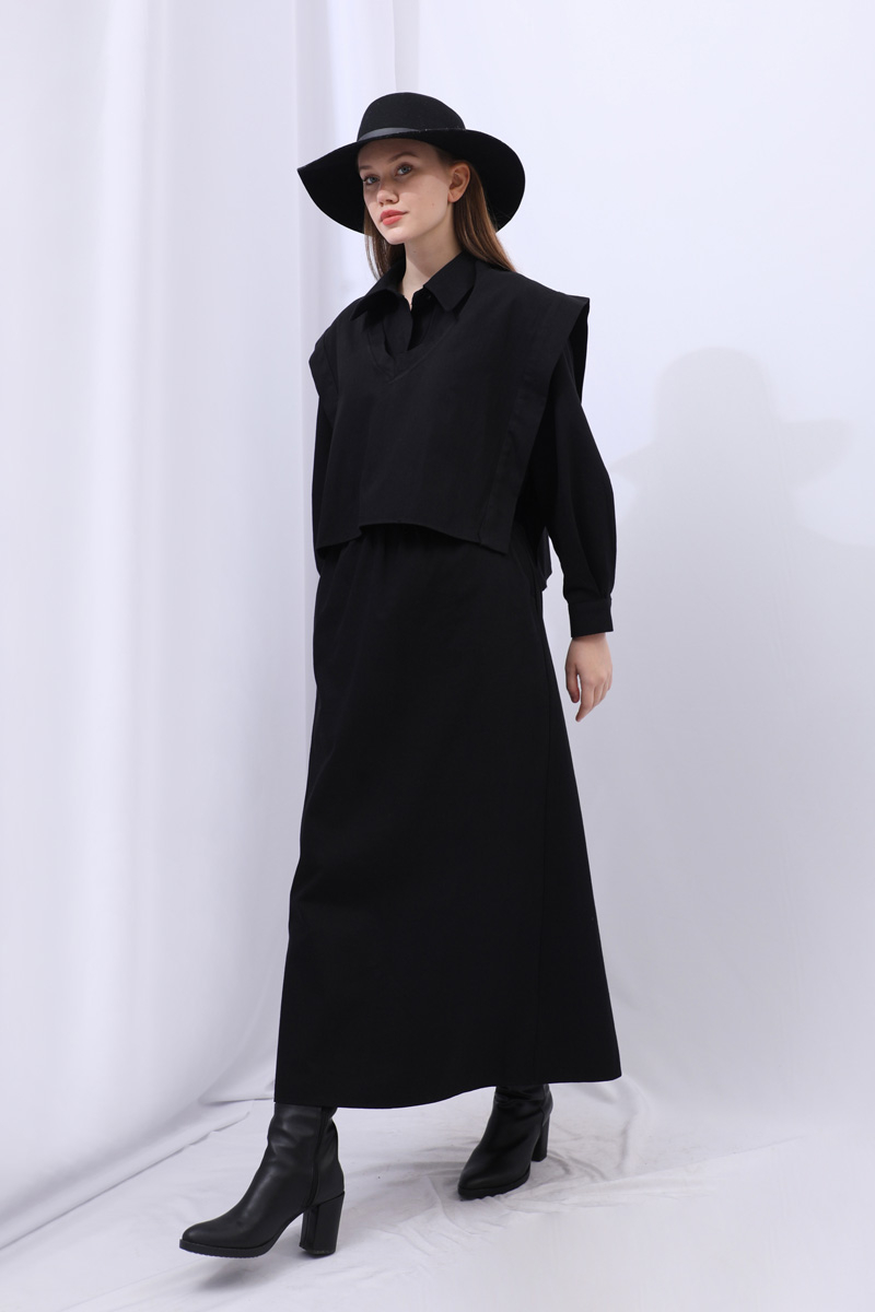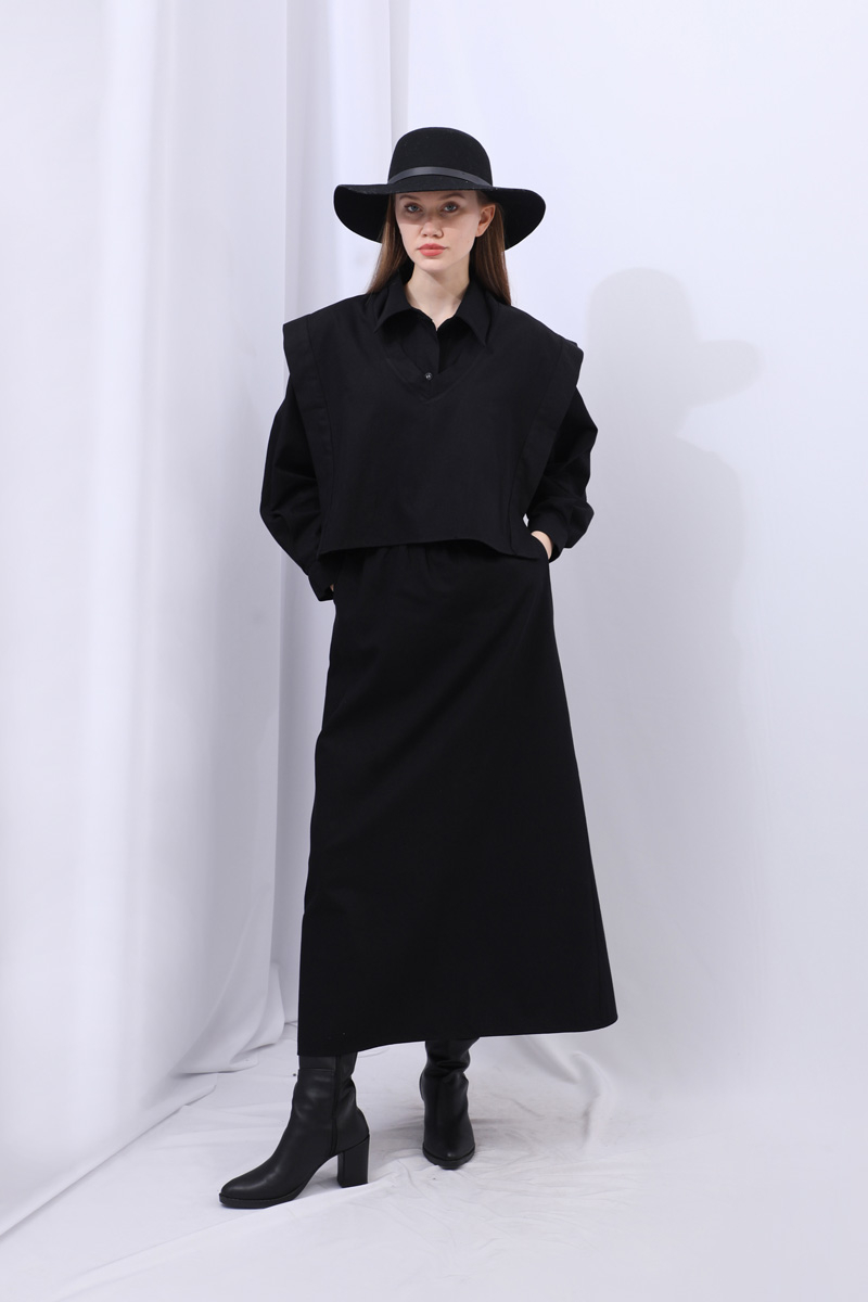 Süveterli Gömlek Etek Takım Siyah. Gömlek sivri yakadır, düşük omuzludur, kolları manşetten pilelidir. Yelek, seyyar yelektir, V yakadır, kuşaklıdır. Etek arka bel lastikli ön bel büzgülüdür, yandan ceplidir, etek arkadan orta dikiş detaylı olup kapalı yırtmaç detaylıdır, astarsızdır. Günlük kullanım ve özel günlerinizde tercih edebilirsiniz.
