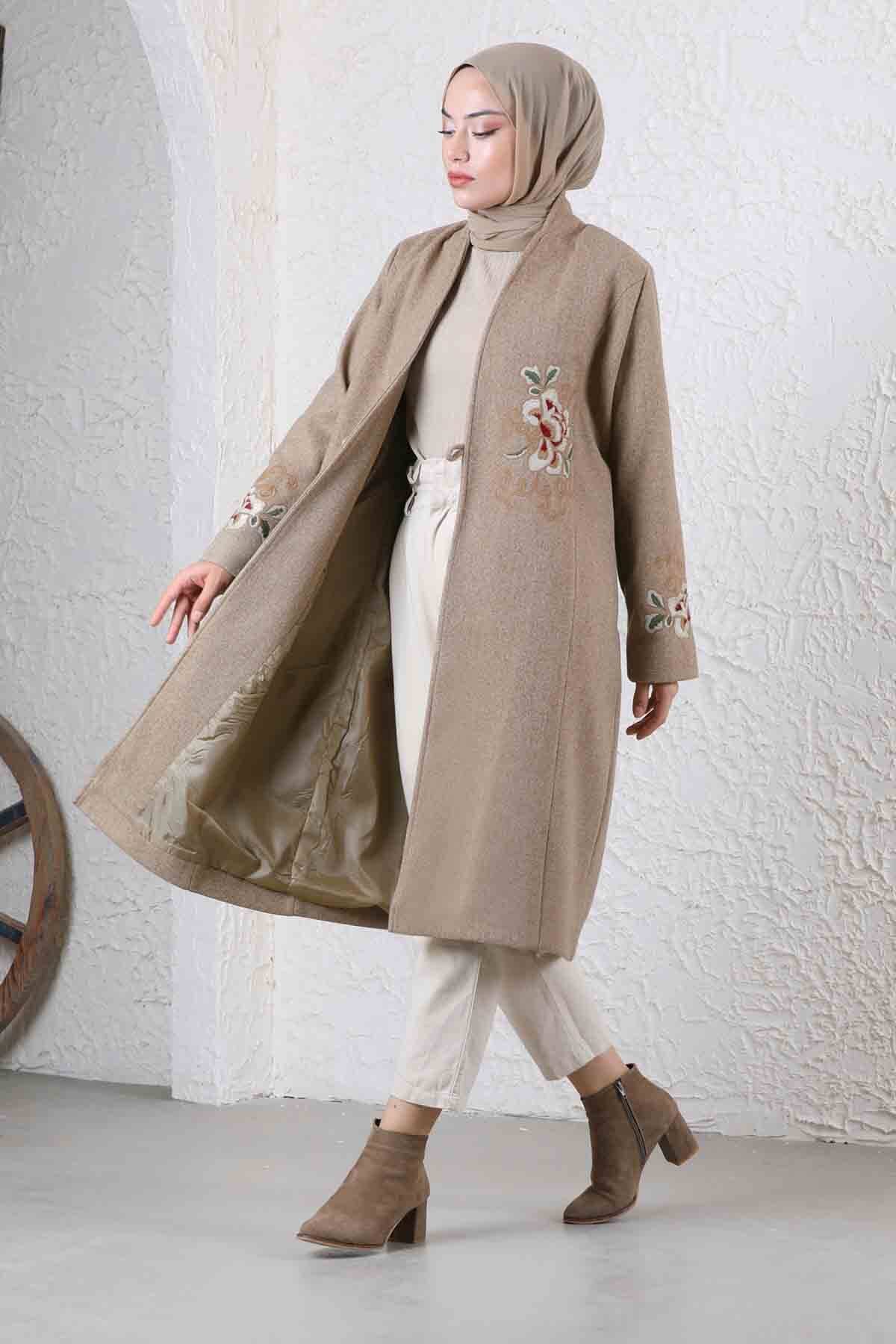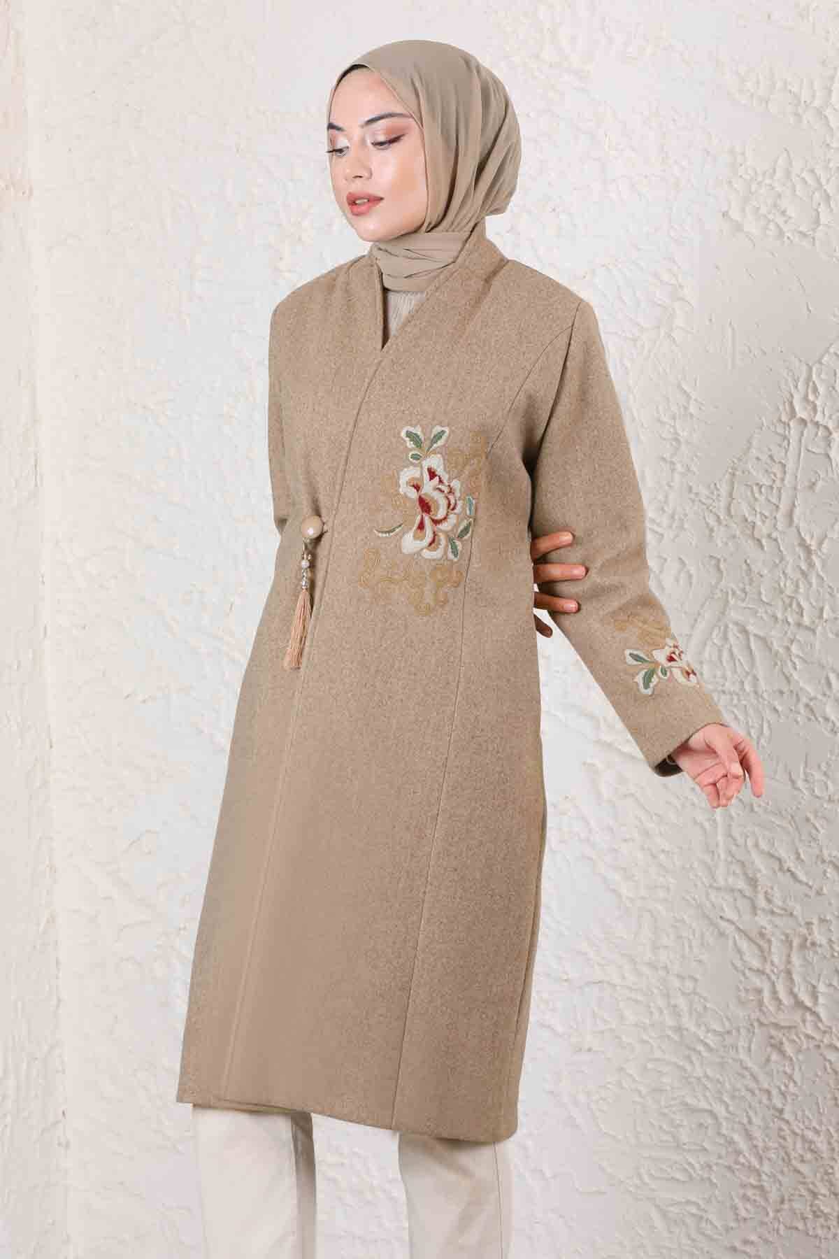 Tasseled Cachet Coat Beige. Front tassel detail buttoned. .It has side pockets. It is full mold. It is lined.