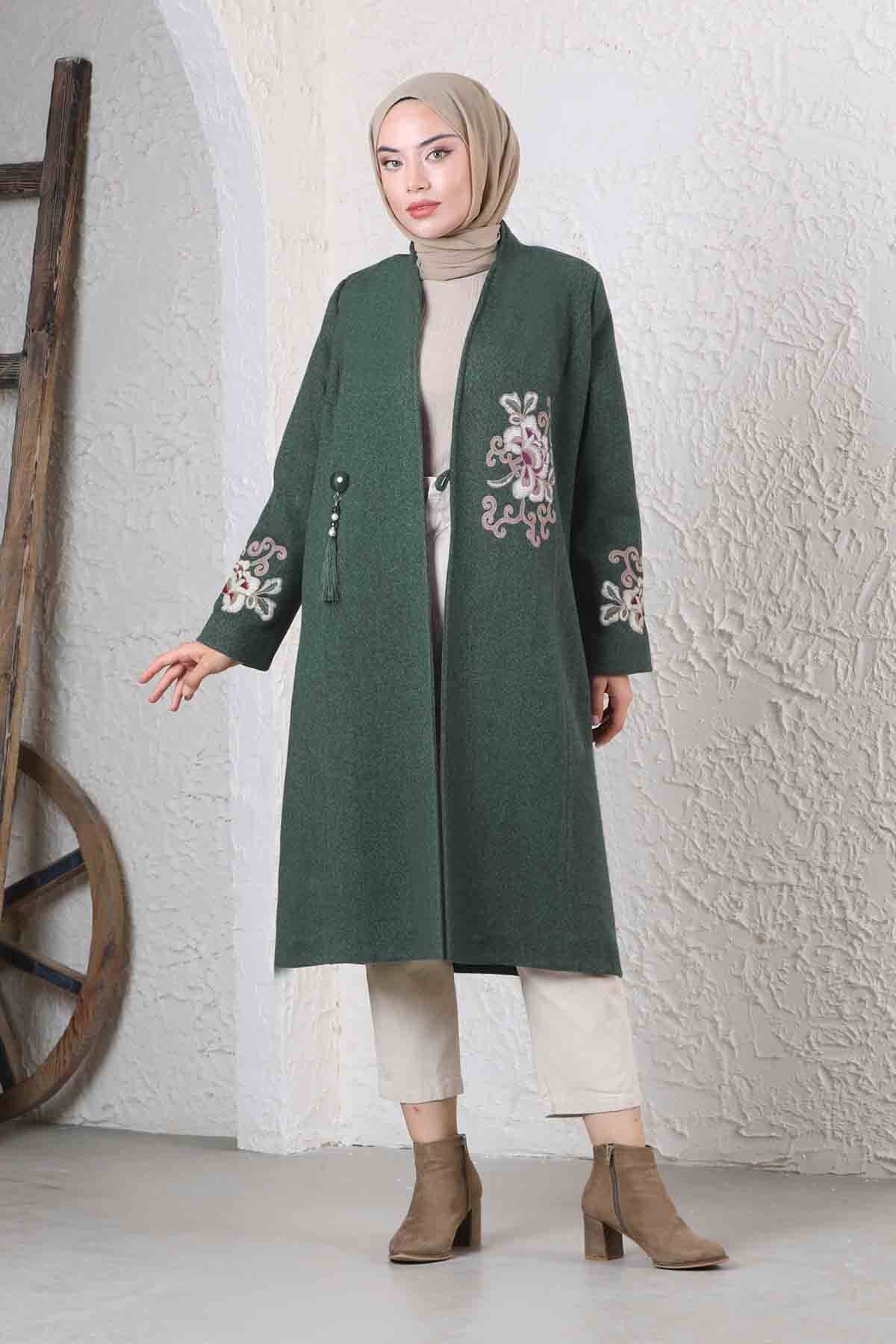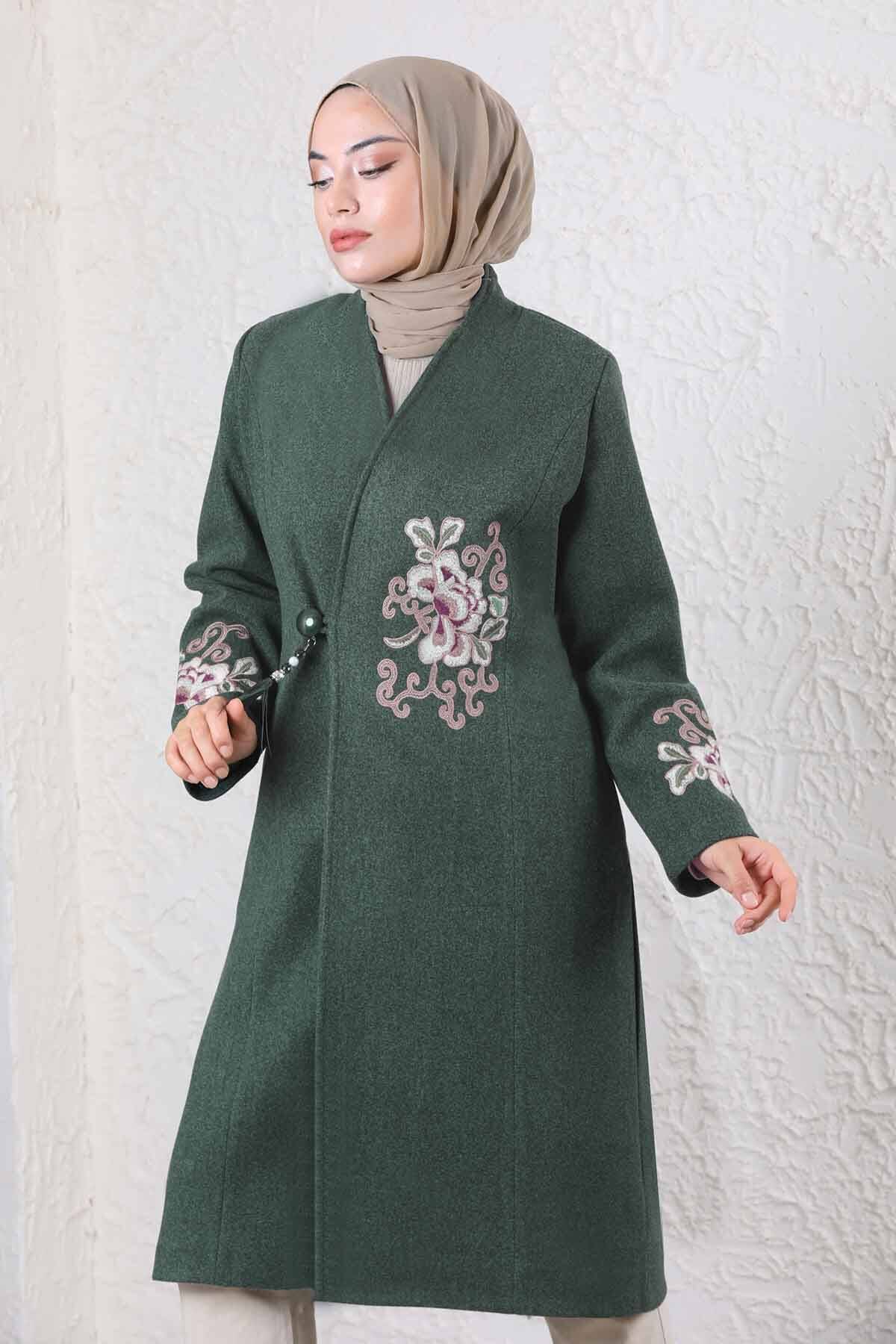 Tasseled Cachet Coat Dark Green. Front tassel detail buttoned. .It has side pockets. It is full mold. It is lined.