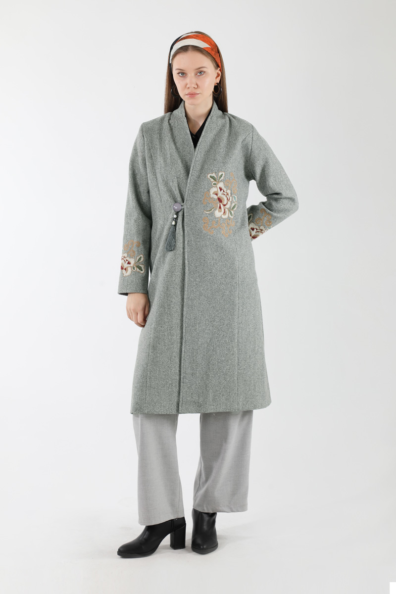 Tasseled Cachet Coat Grey. Front tassel detail buttoned. .It has side pockets. It is full mold. It is lined.