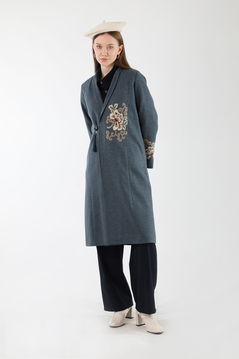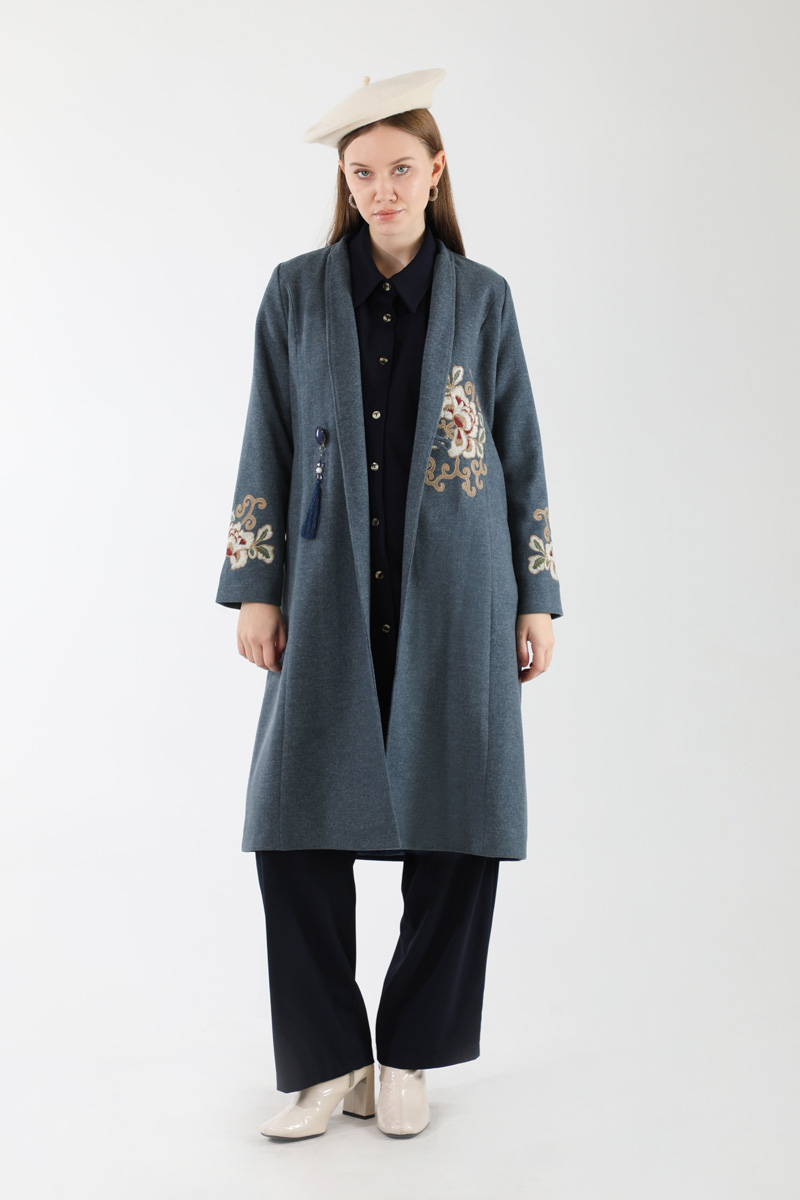 Tasseled Cachet Coat İndigo. Front tassel detail buttoned. .It has side pockets. It is full mold. It is lined.