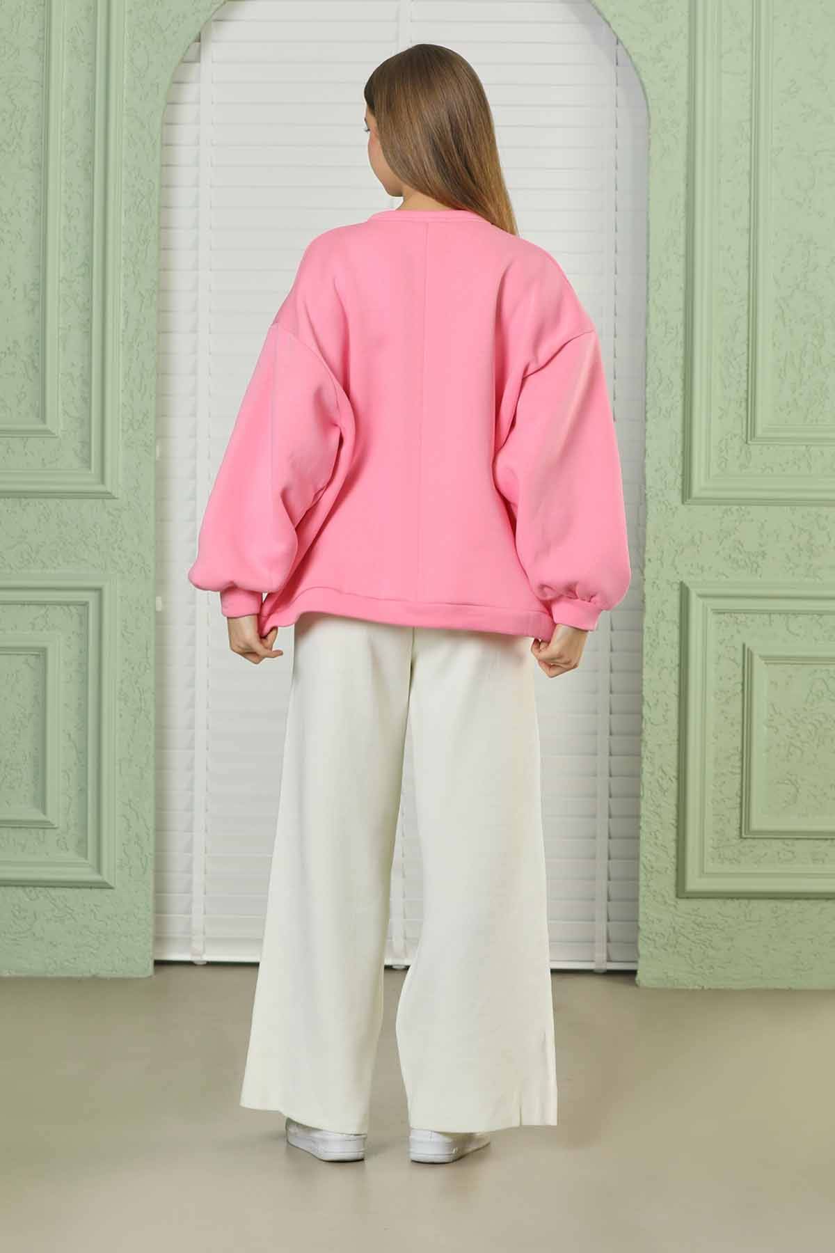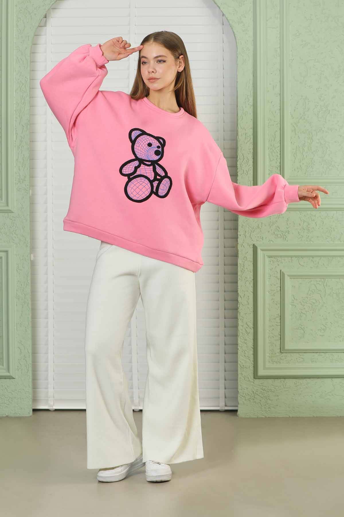 Teddy Bear Embroidered Sweat Pink. Embroidery detail. oversized model