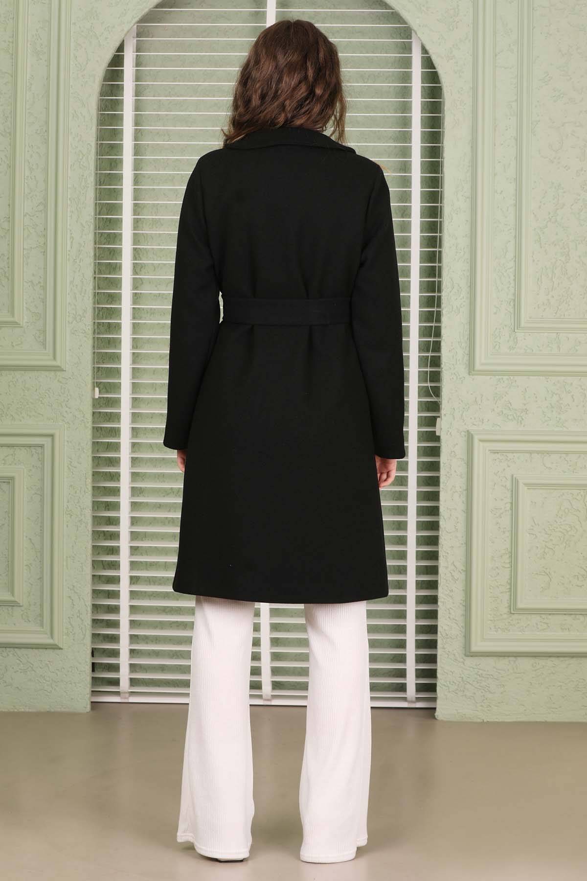 Single Button Cachet Coat Black. It has an oval English wide collar and a one-button double-breasted closure. The trench coat is belted at the waist and has pocket details. The product is lined.
