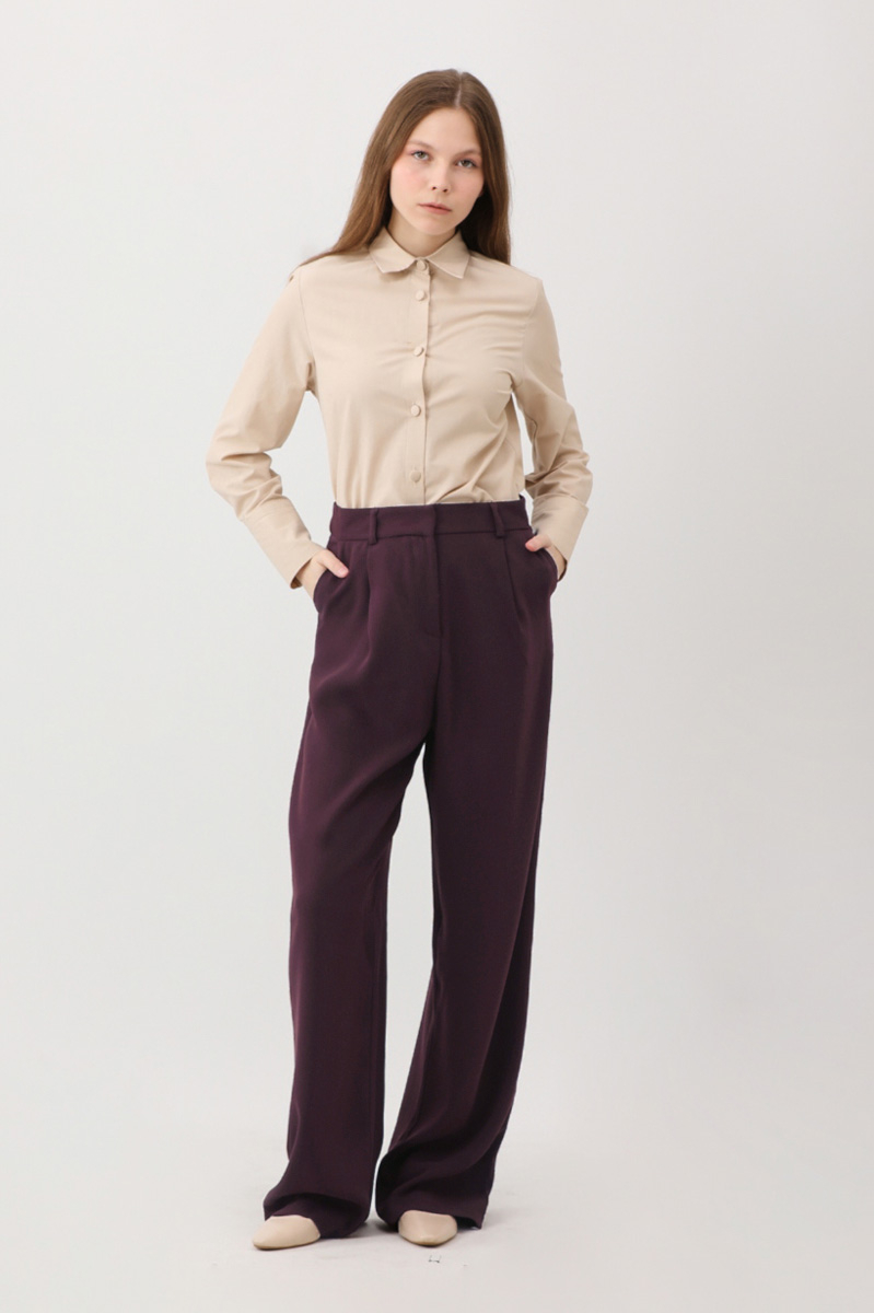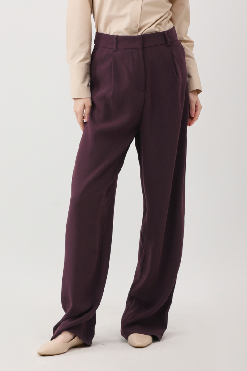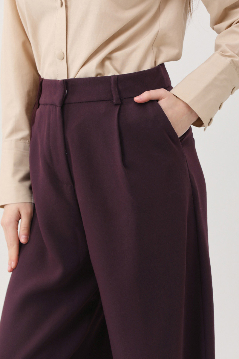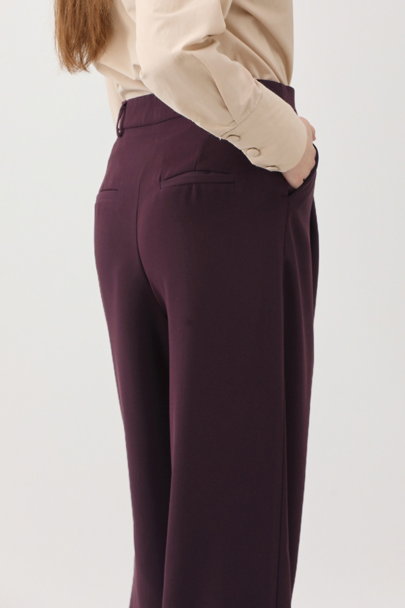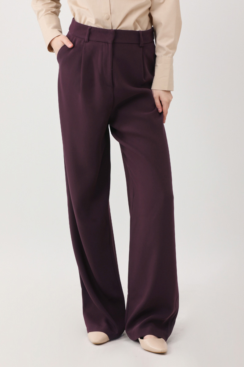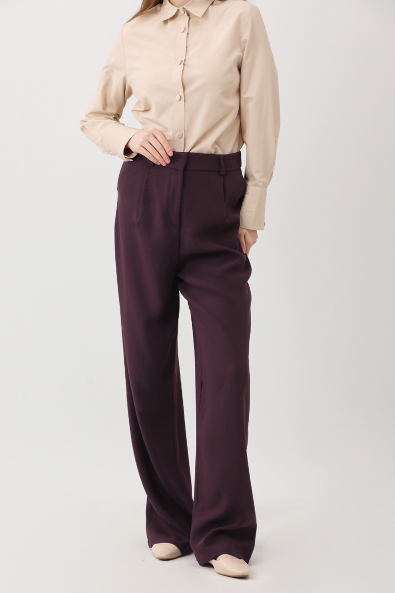 Tek Pileli Pantolon Mürdüm. Önden pilelidir, yandan ceplidir, bol kesimdir, fermuarlı ve düğmelidir, astarsızdır. Günlük kullanım için uygundur.