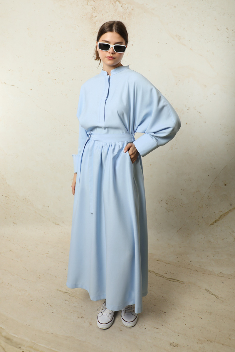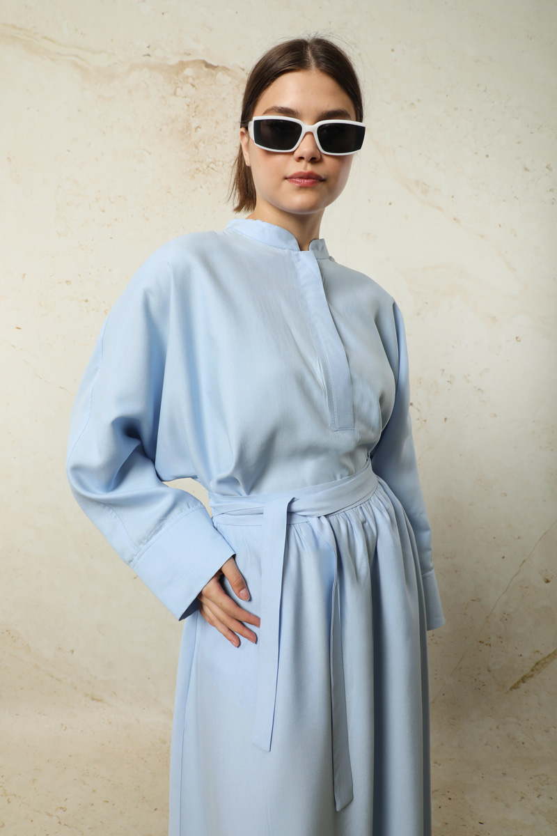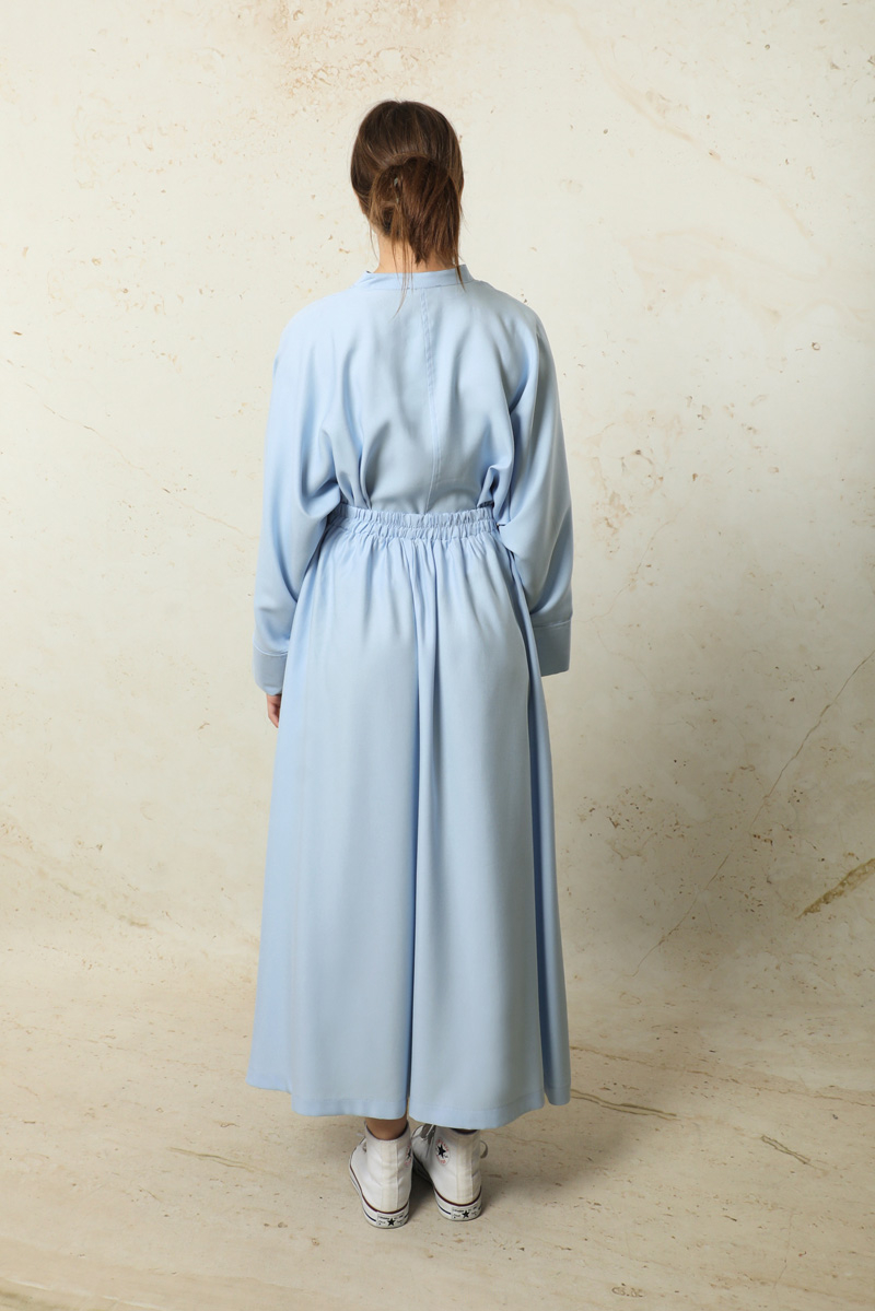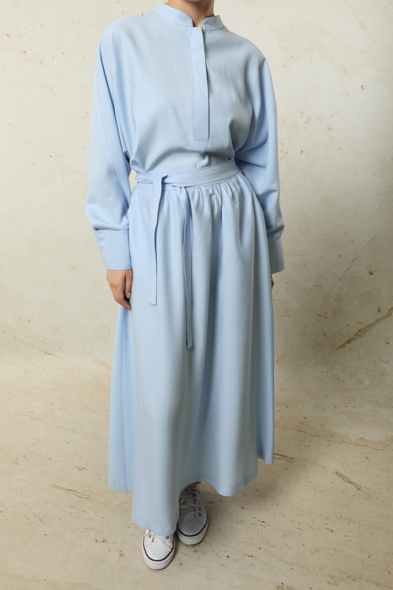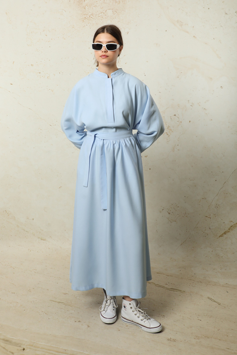 Tensel Etek Takım Bebe Mavisi. Hakim yakalıdır. Yarım Yarasa koldur. Önü yarım pat gizli düğmelidir. Kol kısmı bilezik manşetlidir. Etek yandan ceplidir. Arkadan lastiklidir ve sabit kuşaklıdır. Astarsızdır.