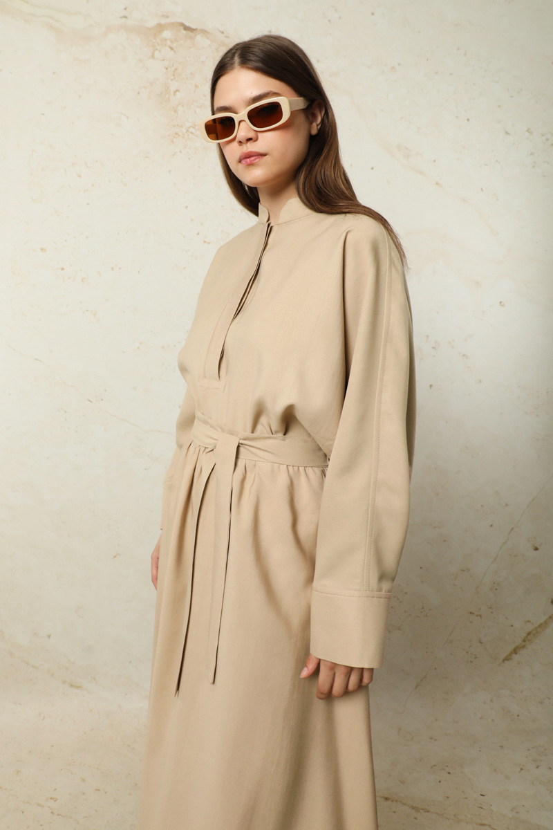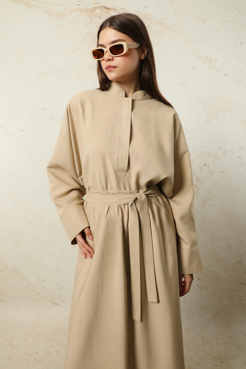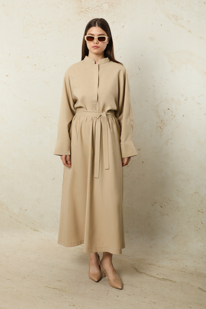 Tensel Etek Takım Bej. Hakim yakalıdır. Yarım Yarasa koldur. Önü yarım pat gizli düğmelidir. Kol kısmı bilezik manşetlidir. Etek yandan ceplidir. Arkadan lastiklidir ve sabit kuşaklıdır. Astarsızdır.