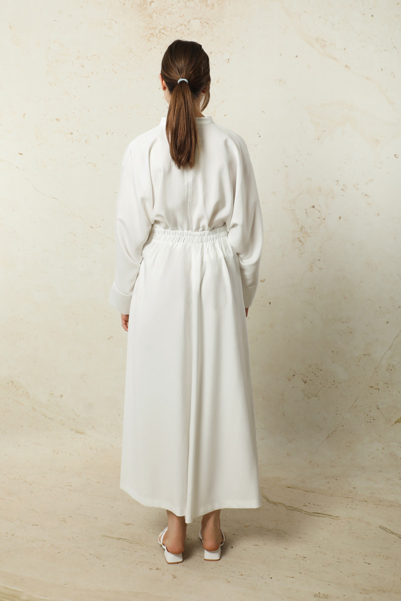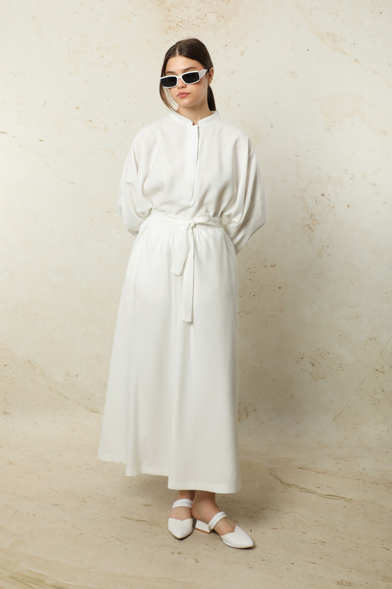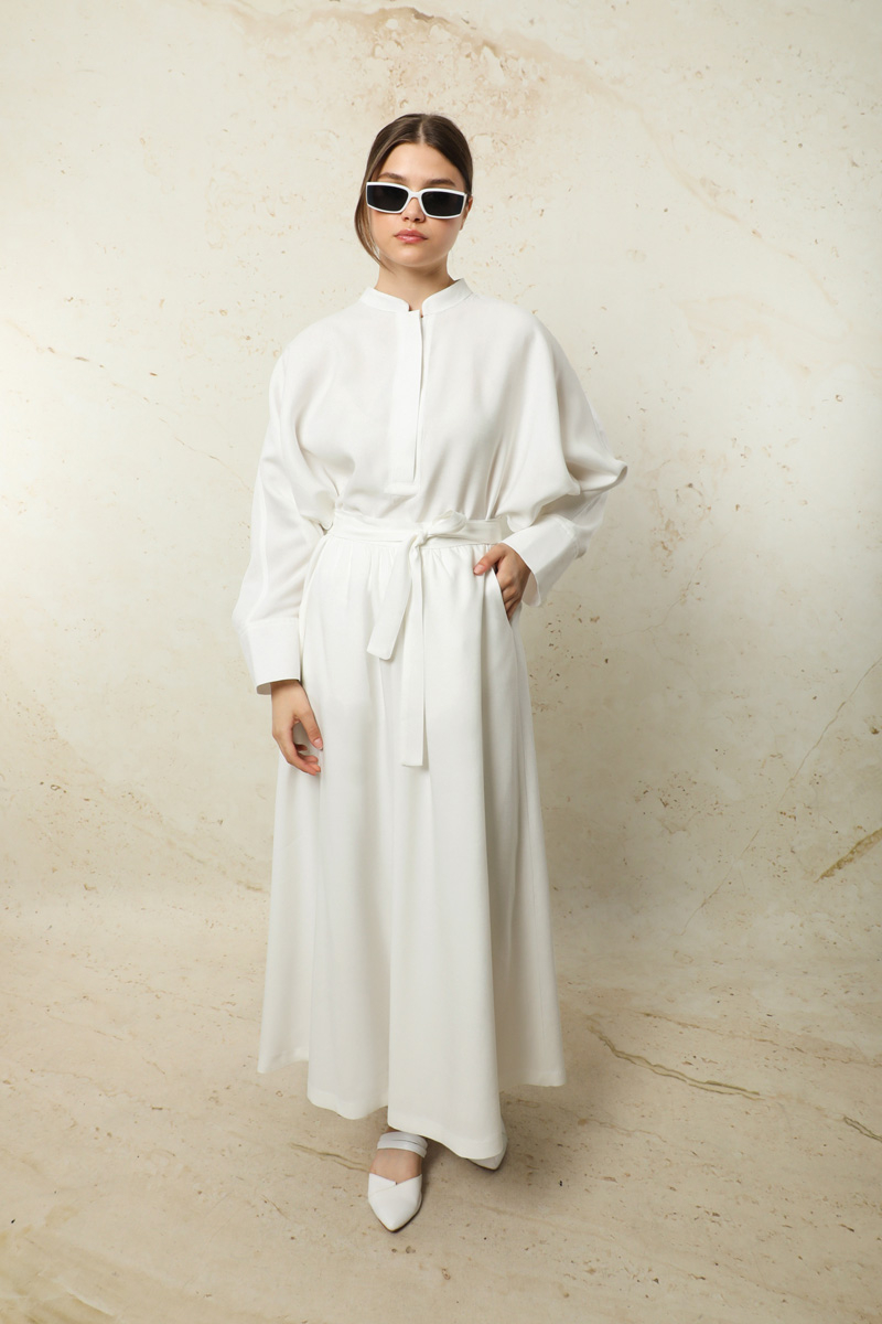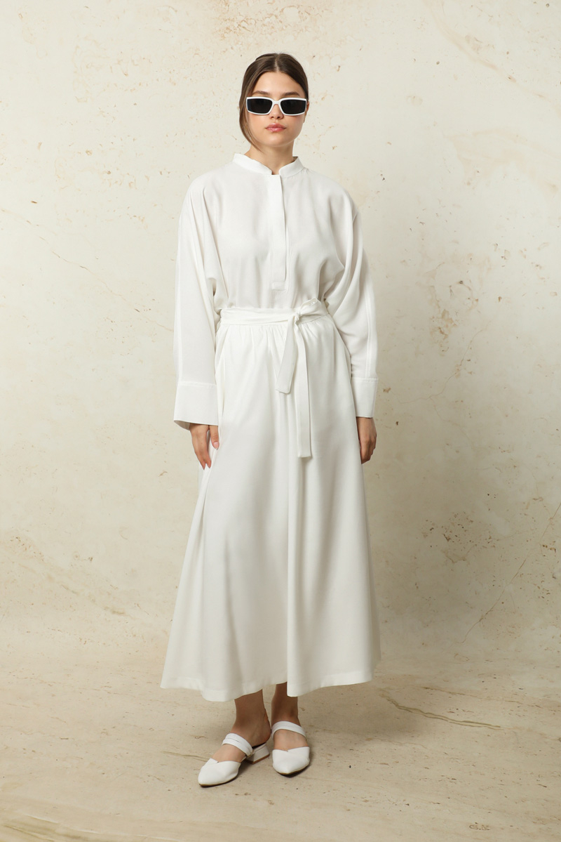 Tensel Etek Takım Beyaz. Hakim yakalıdır. Yarım Yarasa koldur. Önü yarım pat gizli düğmelidir. Kol kısmı bilezik manşetlidir. Etek yandan ceplidir. Arkadan lastiklidir ve sabit kuşaklıdır. Astarsızdır.