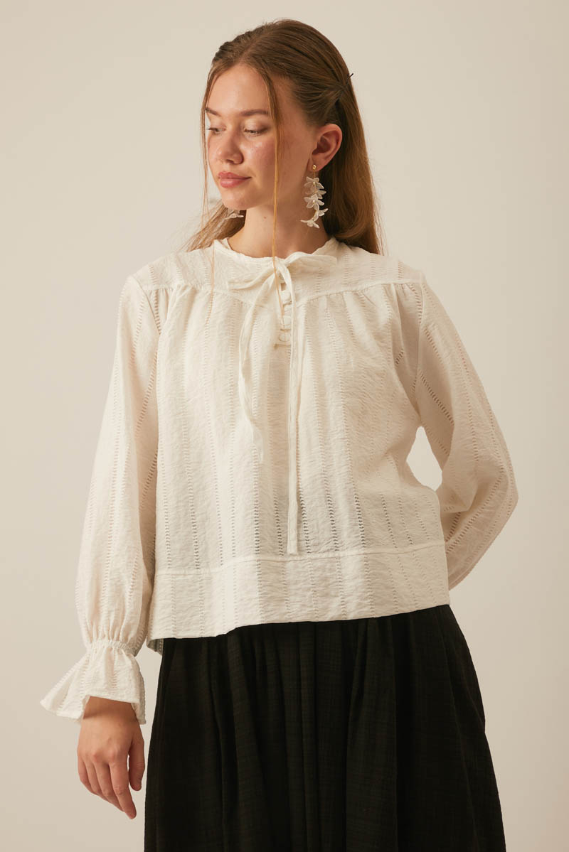 This blouse with a delicate striped texture brings a feminine and airy feel to your wardrobe. Offering an eye-catching elegance with its subtle stripe texture and ruffle details, it also ensures all-day comfort thanks to its relaxed fit. Ideal for both everyday wear and more special occasions.