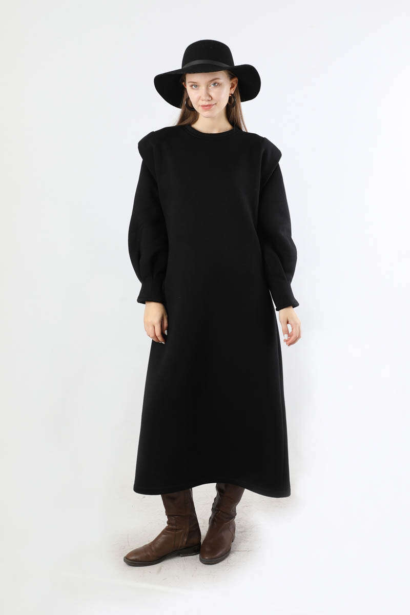 Oversize Three Thread Dress Black. It has a round neckline and the cuff is stitched detail. It is beltless and pocketless. In the image, the shirt detail on the collar of the product is used as an accessory. It is not included in the dress.