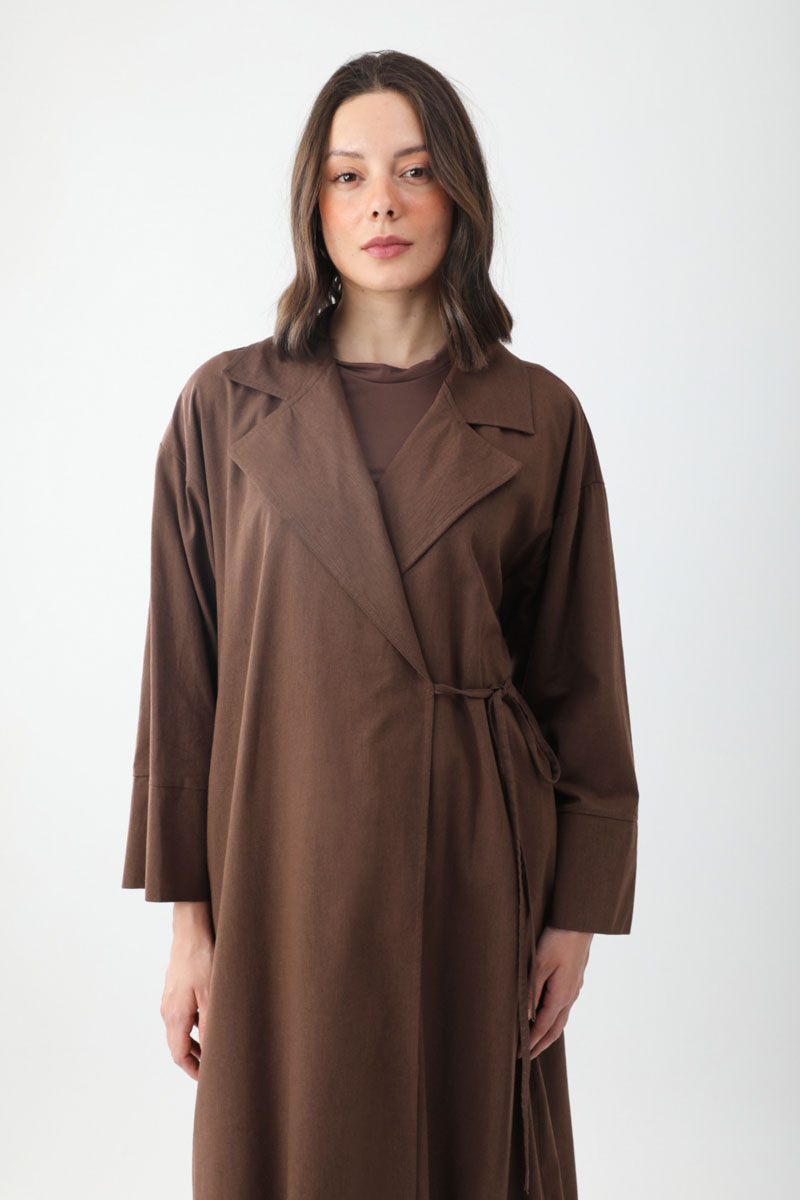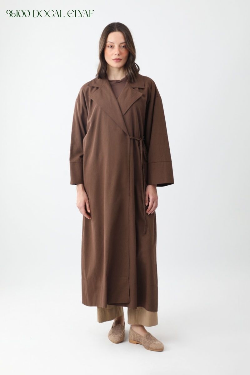 This trench coat features a classic jacket collar and a double-breasted front. Designed with a slim waist tie and practical side pockets, it effortlessly blends elegance and comfort. Suitable for both everyday wear and special occasions.