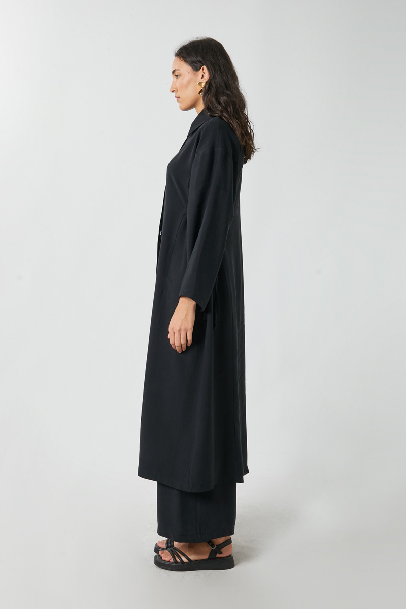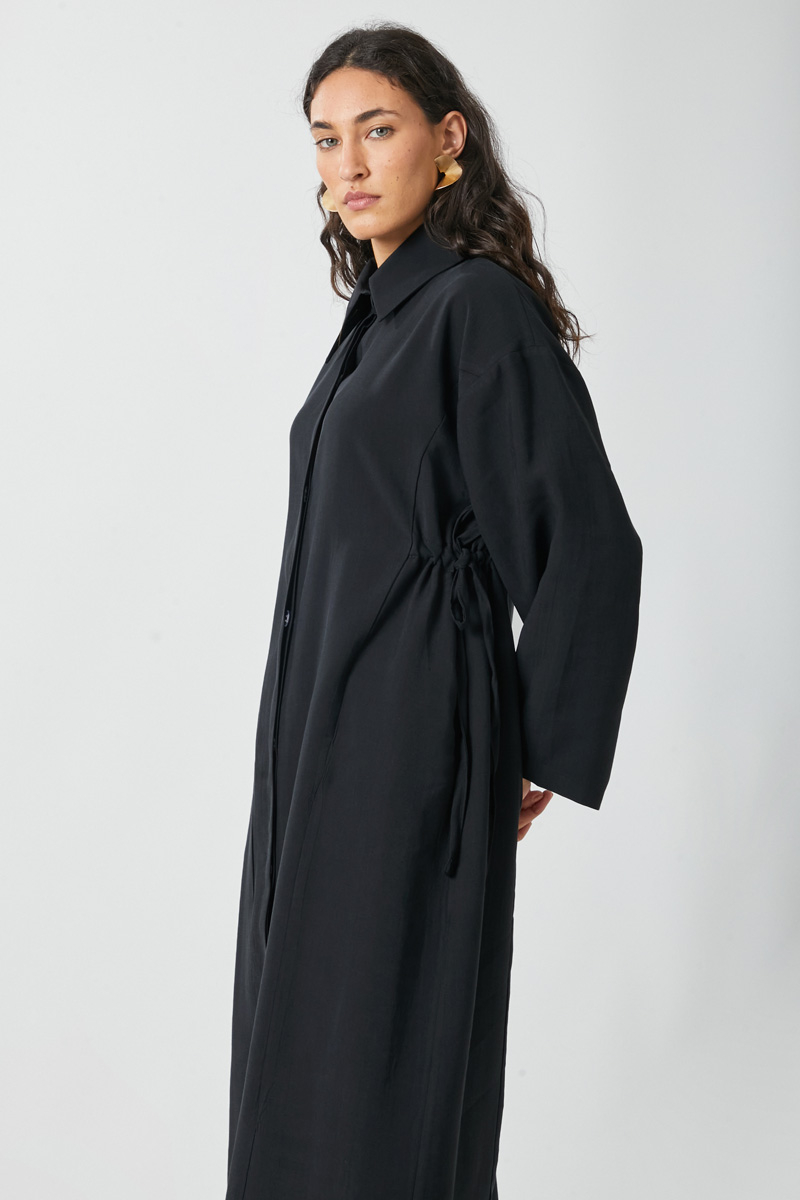 This elegant set features a shirt collar and a hidden button placket down the front. The tunic has drop shoulders and a tie detail on the left side for a flattering, adjustable fit. It also features panel stitch detailing.