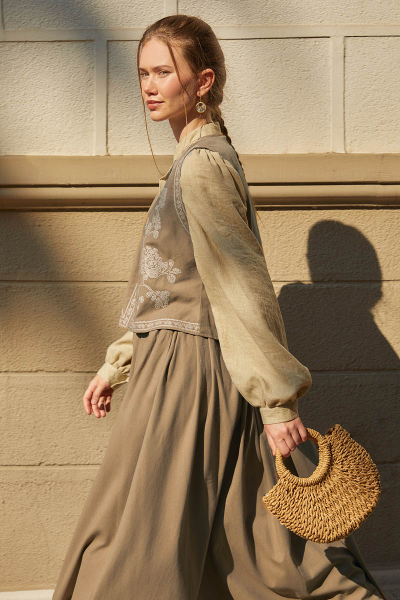 bu natural keten takımda hayat buluyor. Yeleğin zarif deseni ve