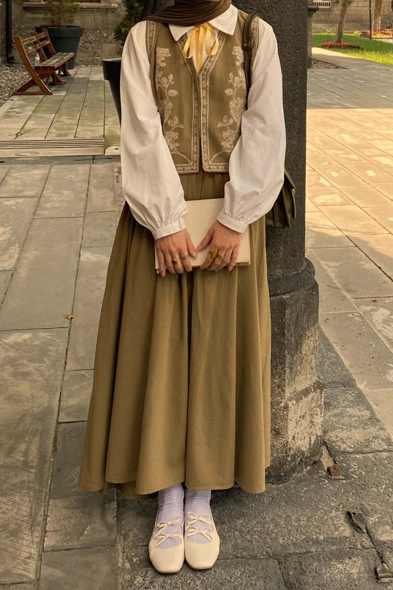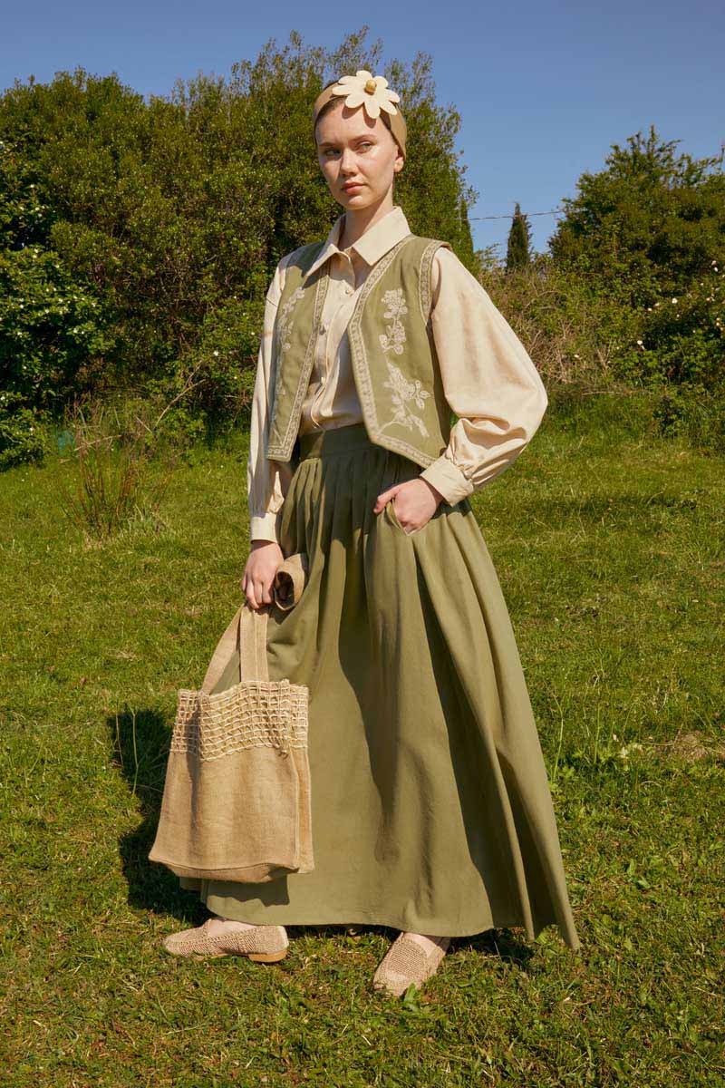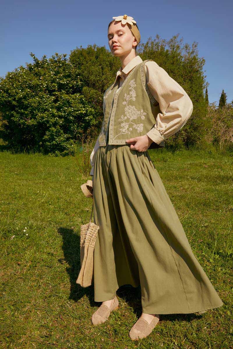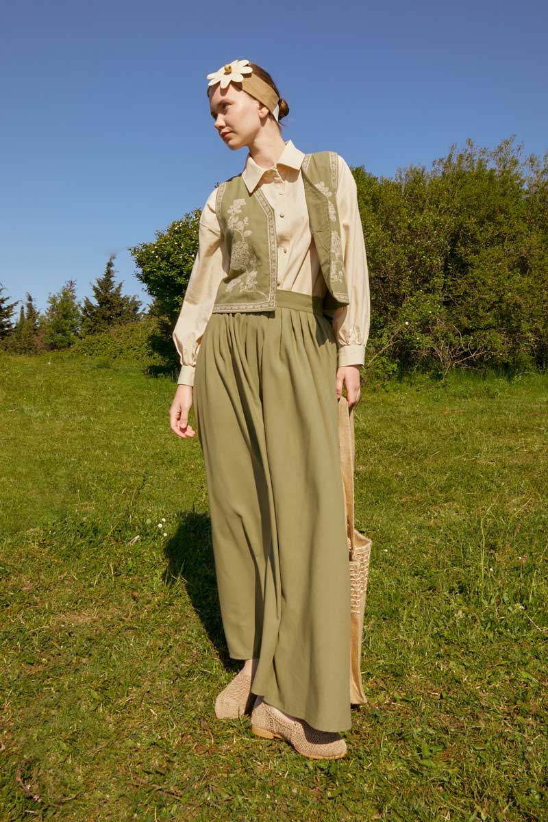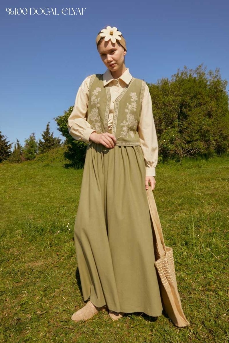 bu natural keten takımda hayat buluyor. Yeleğin zarif deseni ve