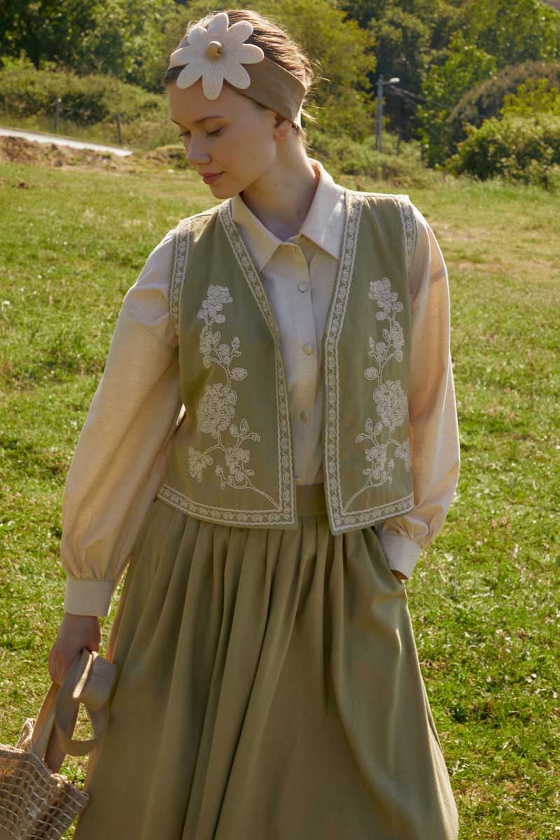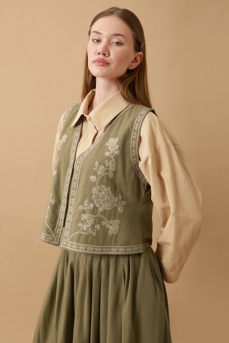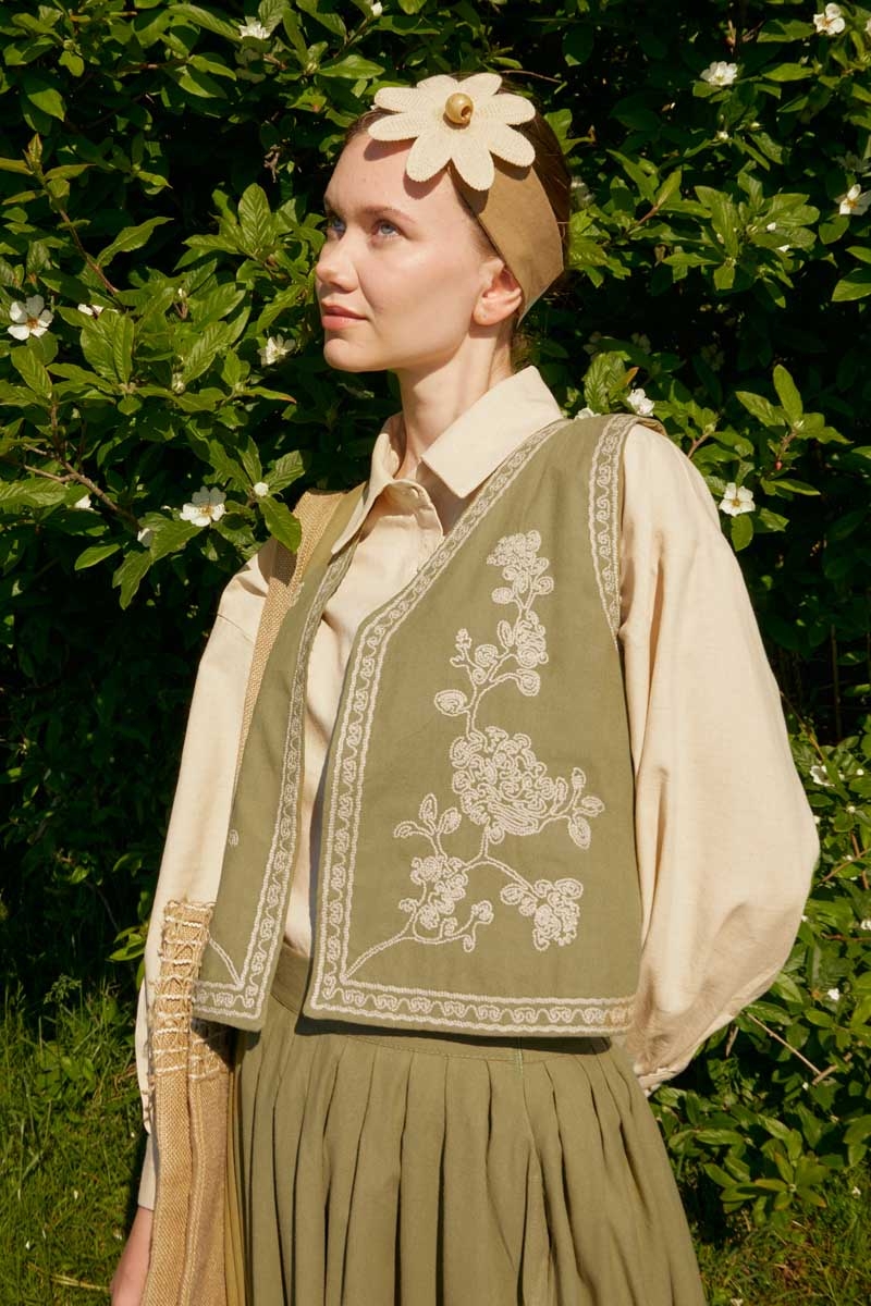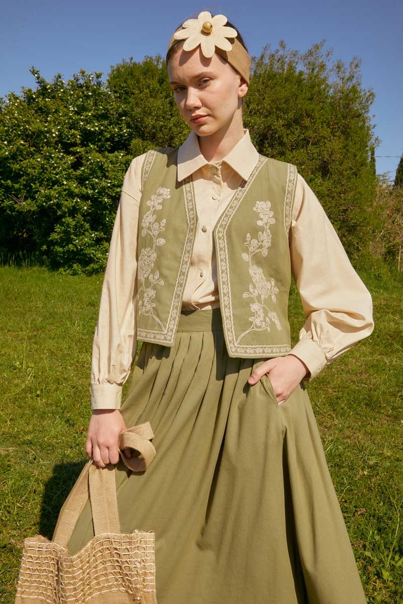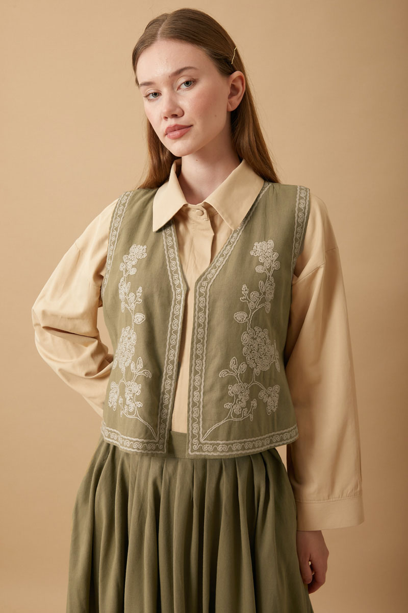 bu natural keten takımda hayat buluyor. Yeleğin zarif deseni ve