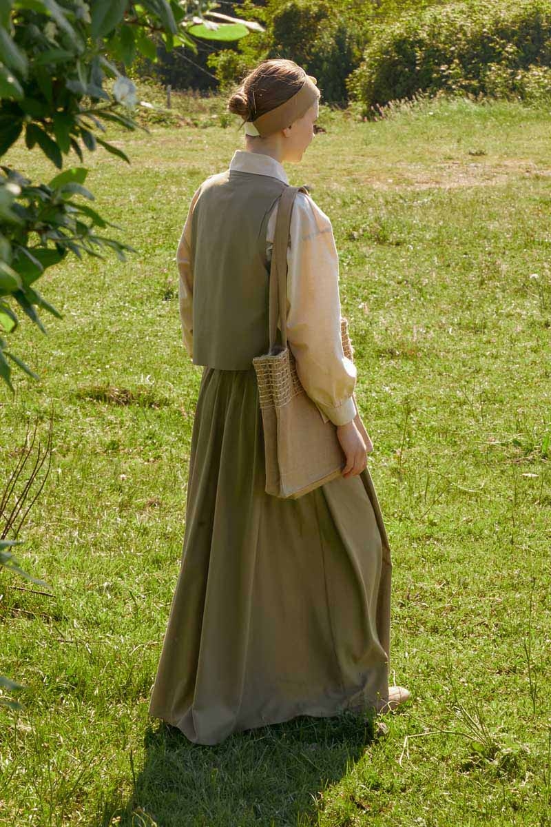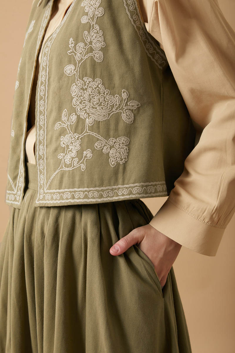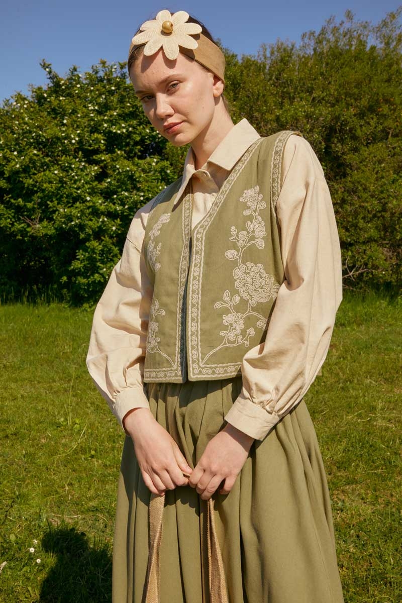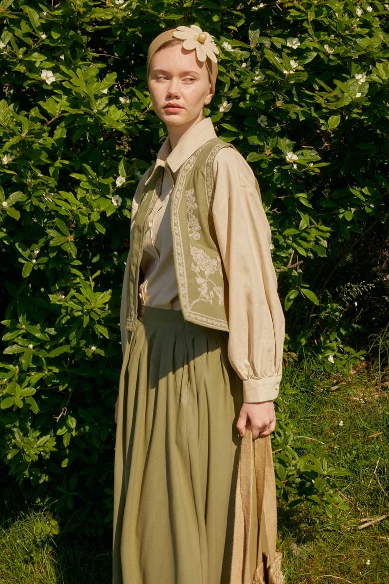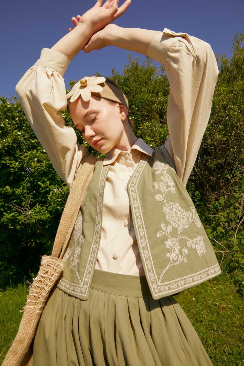 bu natural keten takımda hayat buluyor. Yeleğin zarif deseni ve