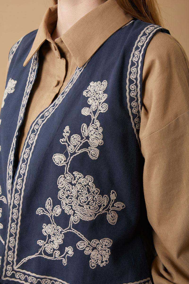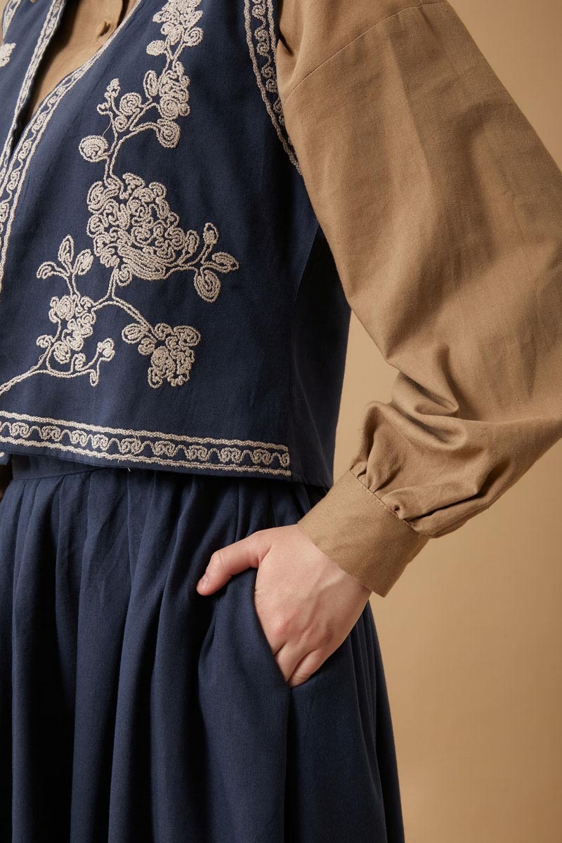 bu natural keten takımda hayat buluyor. Yeleğin zarif deseni ve