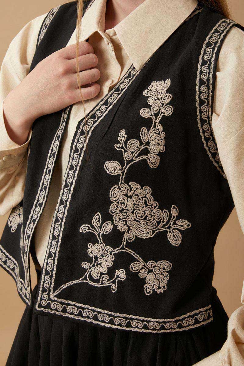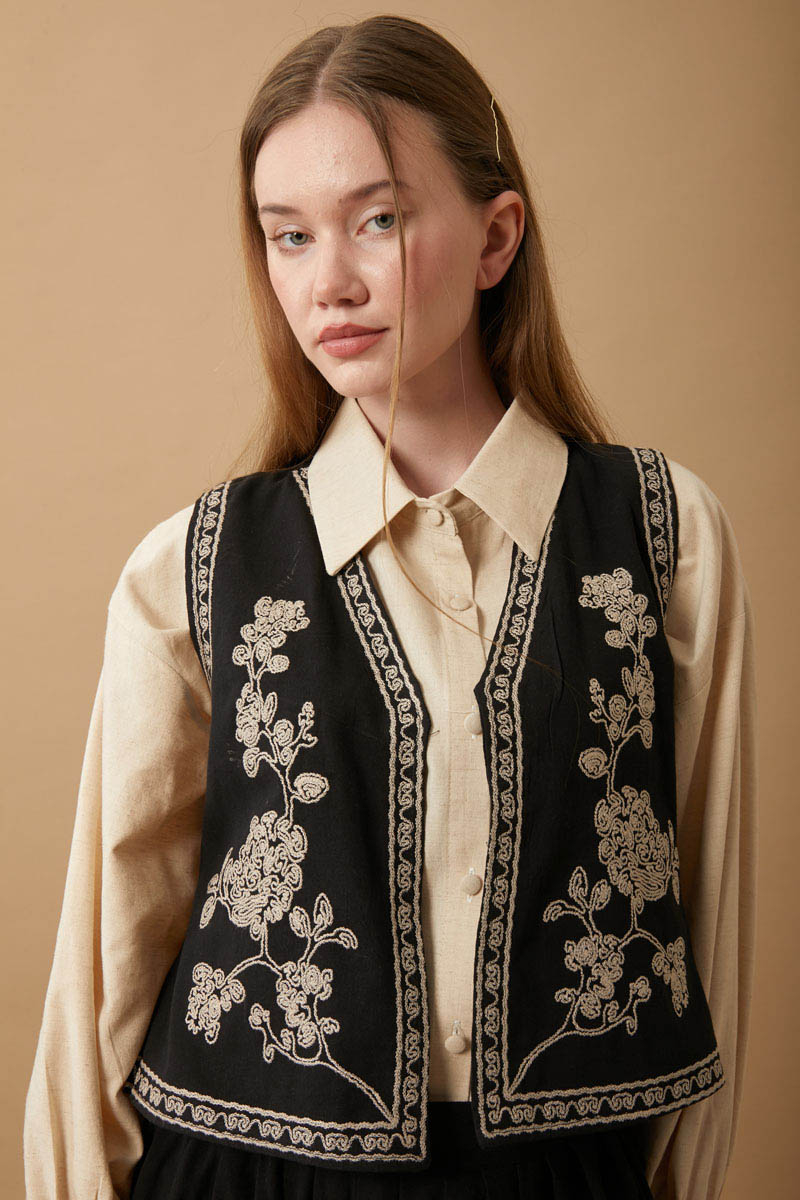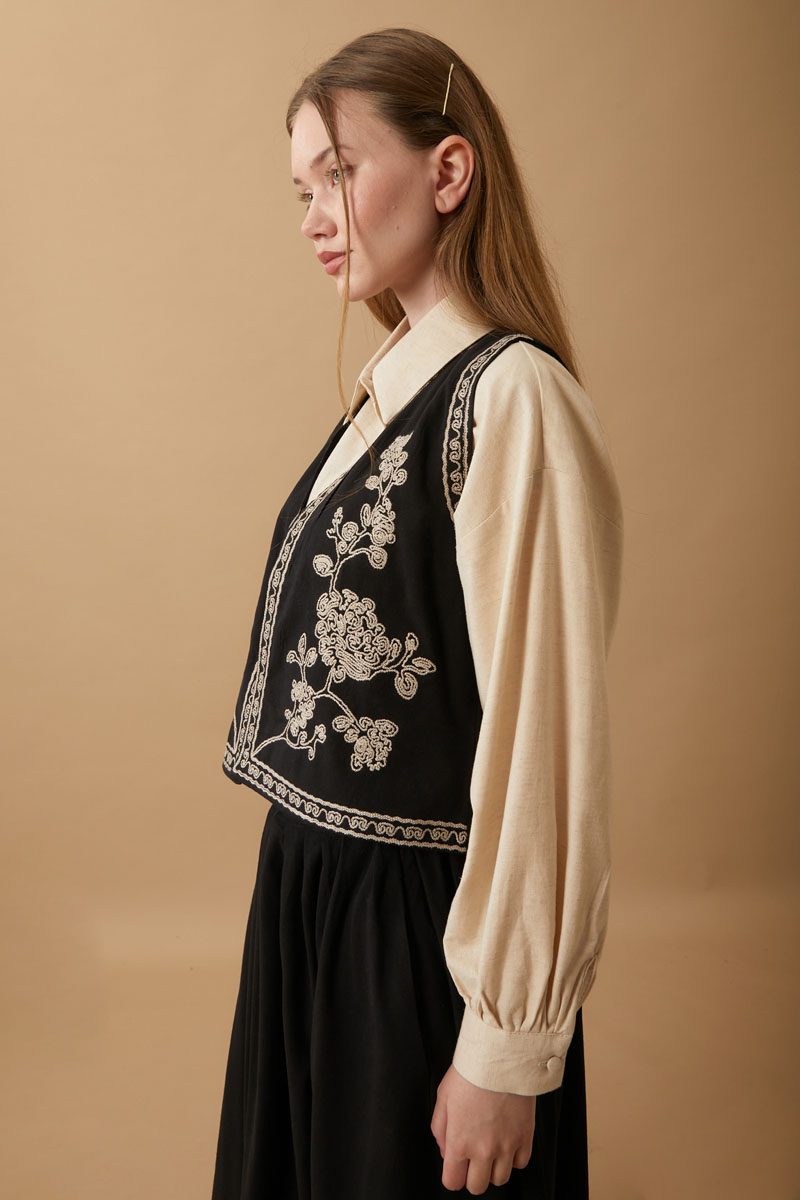 bu natural keten takımda hayat buluyor. Yeleğin zarif deseni ve