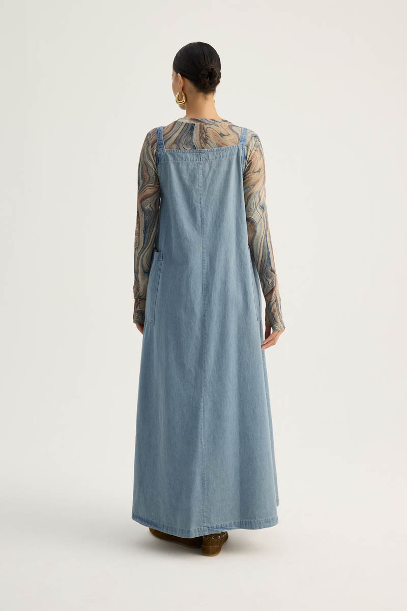 Torba Cepli Denim Jile Buz Mavisi Kare yakadır, askıları düğme ile ayarlanılabilir,, önden pilelidir, yandan büyük torba cep detaylıdır, astarsızdır. Günlük kullanım ve özel günlerinizde tercih edebilirsiniz.