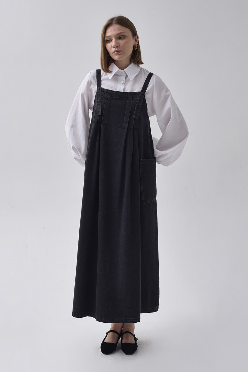 Torba Cepli Denim Jile Siyah. Kare yakadır, askıları düğme ile ayarlanılabilir,, önden pilelidir, yandan büyük torba cep detaylıdır, astarsızdır. Günlük kullanım ve özel günlerinizde tercih edebilirsiniz.