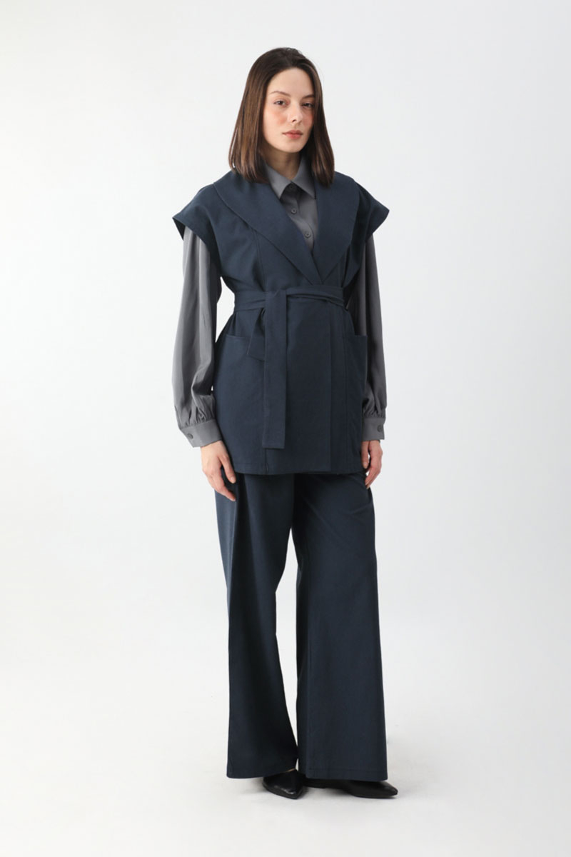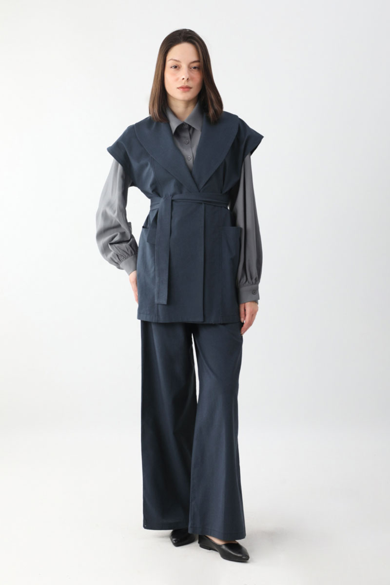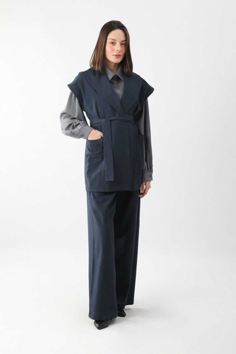 Torba Cepli Yelek Takım Lacivert. Kruvaze yakadır, parça detaylıdır, büyük ceplidir, kuşaklıdır, Pantolon belden lastiklidir, önden pilelidir, yandan ceplidir, düğmeli ve fermuarlıdır. Günlük kullanım ve özel günlerinizde tercih edebilirsiniz.
