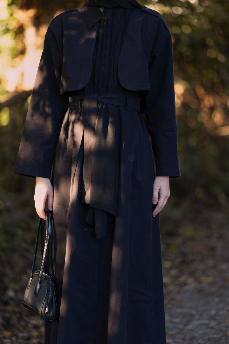 Trench Dress with Storm Flap Black, combines the timeless silhouette of a trench coat with the elegance of a dress, blending classic and modern lines in one refined design. The storm flap detail on the upper part and shoulder epaulettes add a dynamic touch, while the waist belt gracefully accentuates the body shape. With its long form and lightly draped structure, it offers both comfort and style during seasonal transitions. Suitable for a wide range of occasions—from everyday city looks to special events.