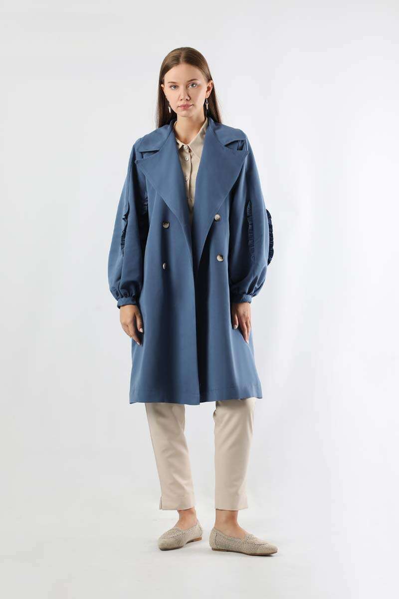 Trench İndigo With Frilled Sleeves. Wide English collar. It is lined. It has two side pockets. It is a double-breasted closure. Travel belt is available.