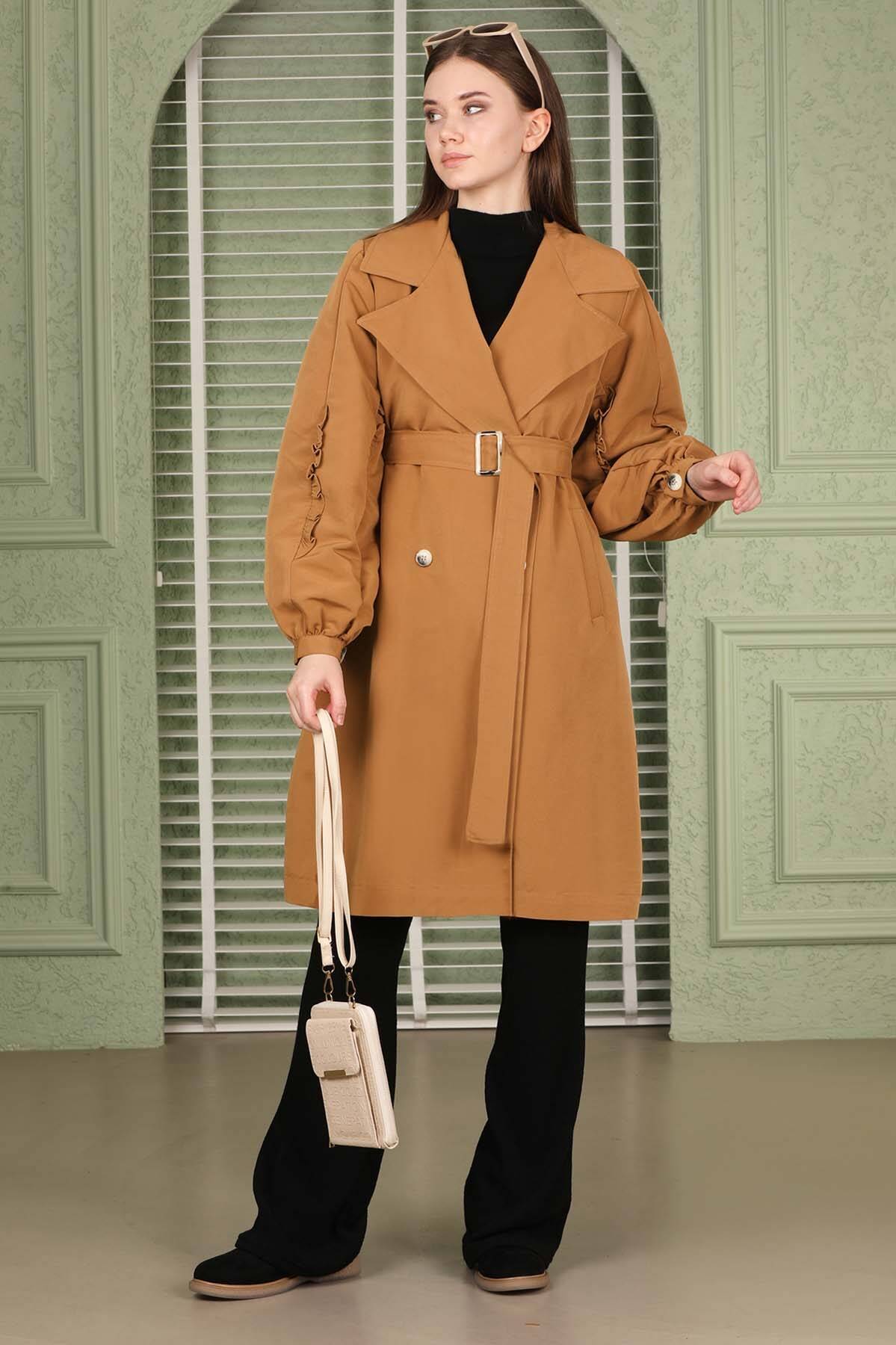 Trench Tan With Frilled Sleeves. Wide English collar. It is lined. It has two side pockets. It is a double-breasted closure. Travel belt is available.