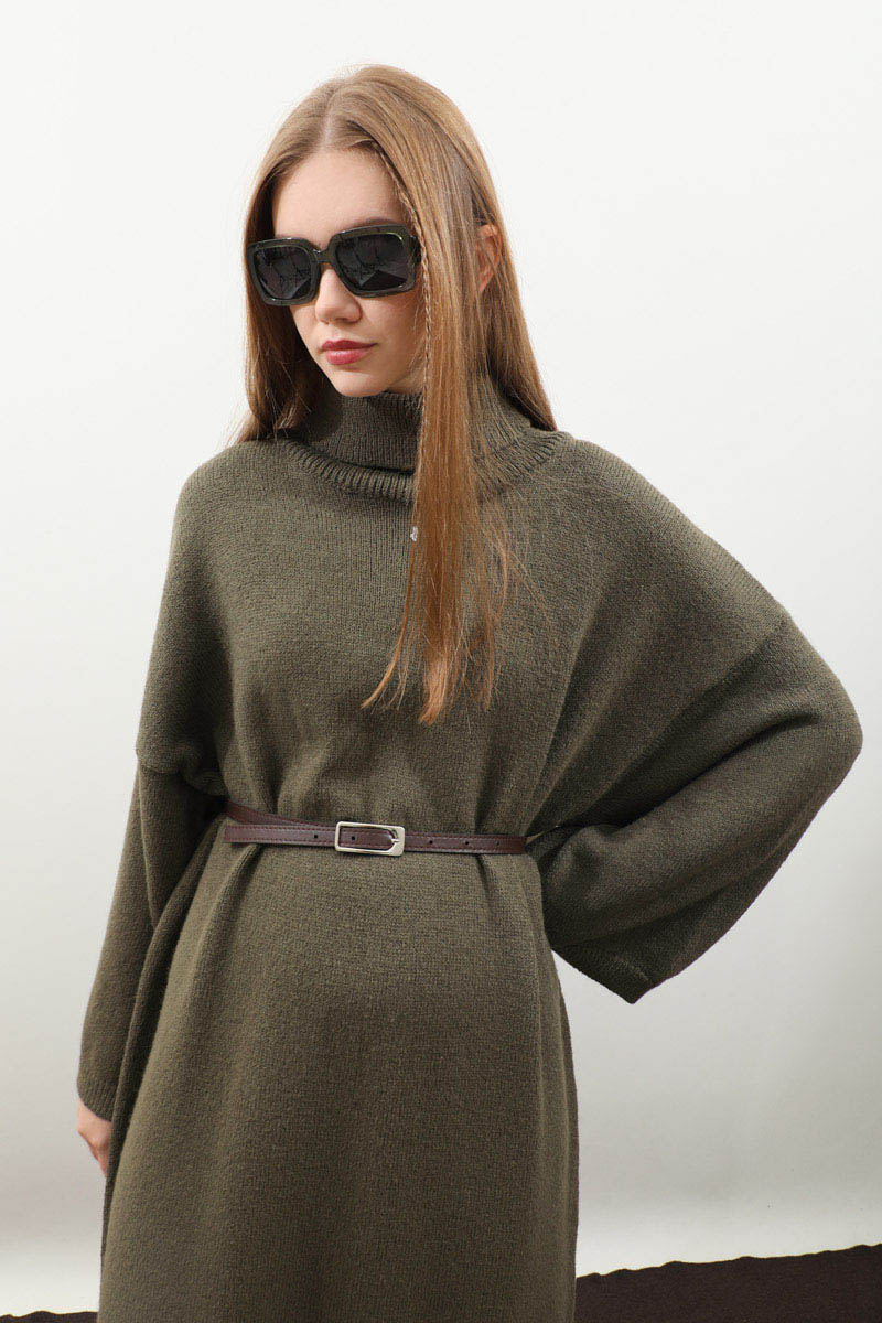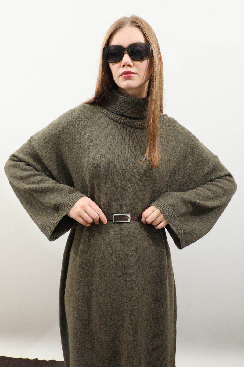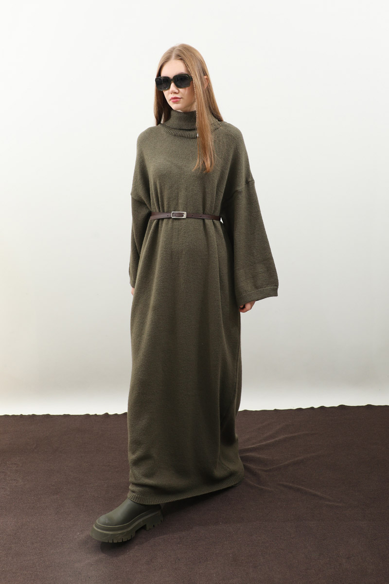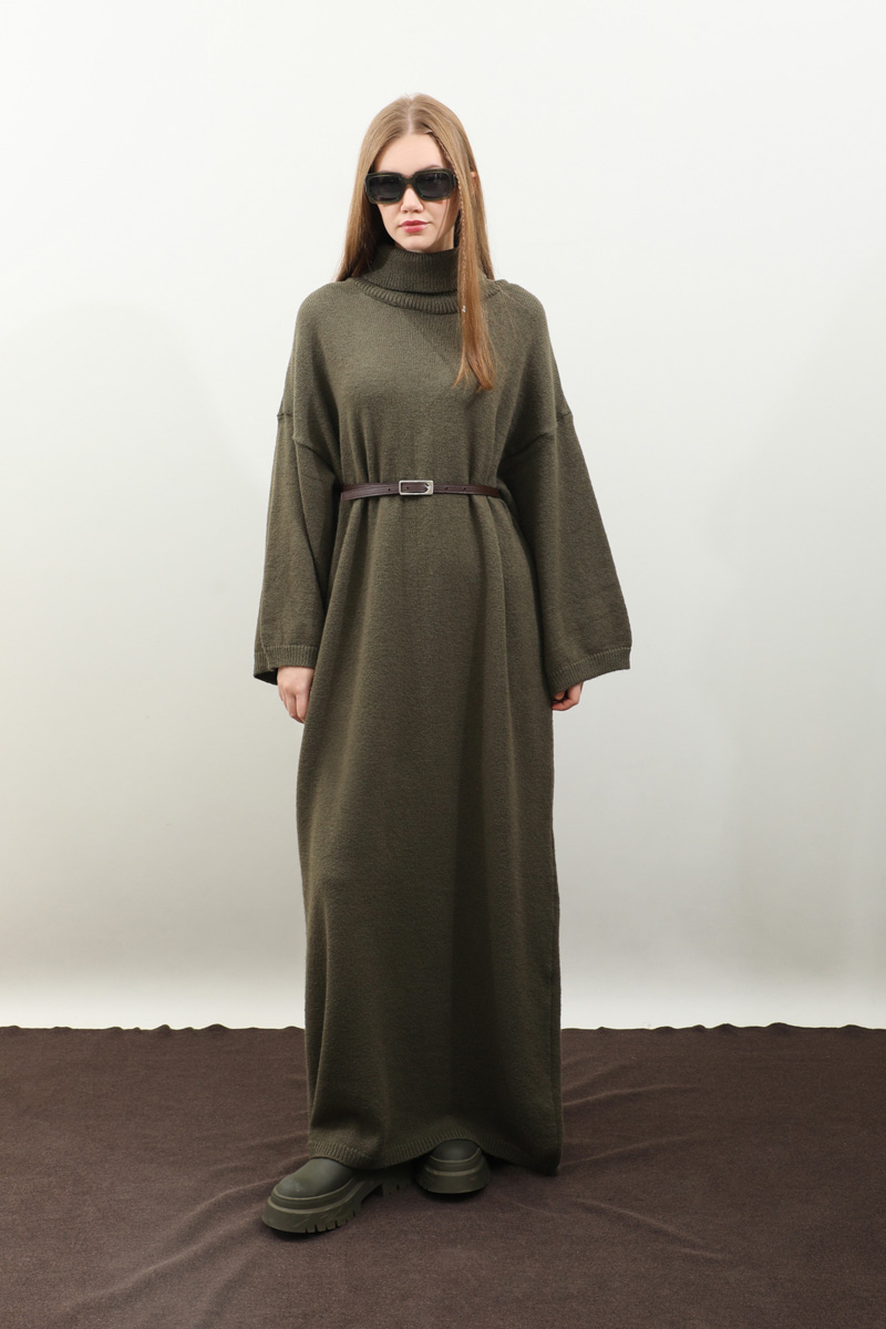Triko Elbise Haki. Balıkçı boğazdır, düşük omuzludur, geniş kol ağızlıdır, cepsizdir, kemerlidir., astarsızdır, örme kumaştır iç göstermez. Günlük kullanım ve özel günlerinizde tercih edebilirsiniz.