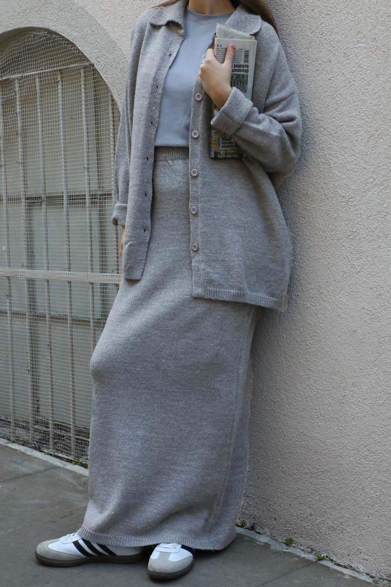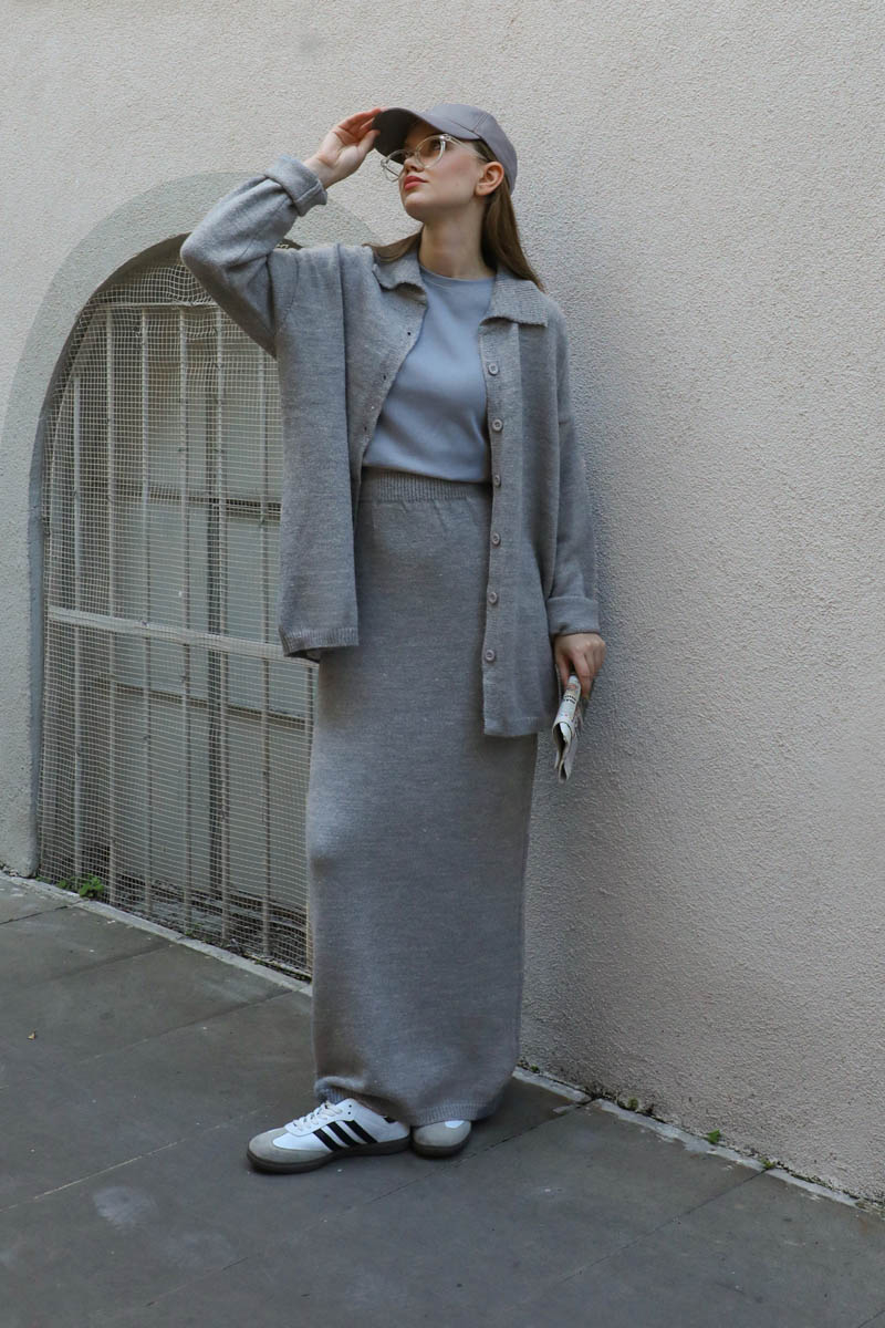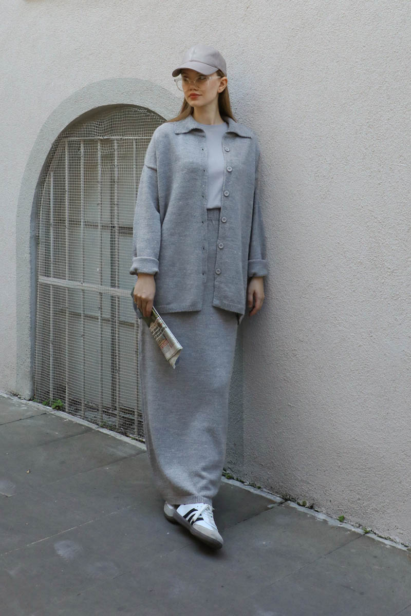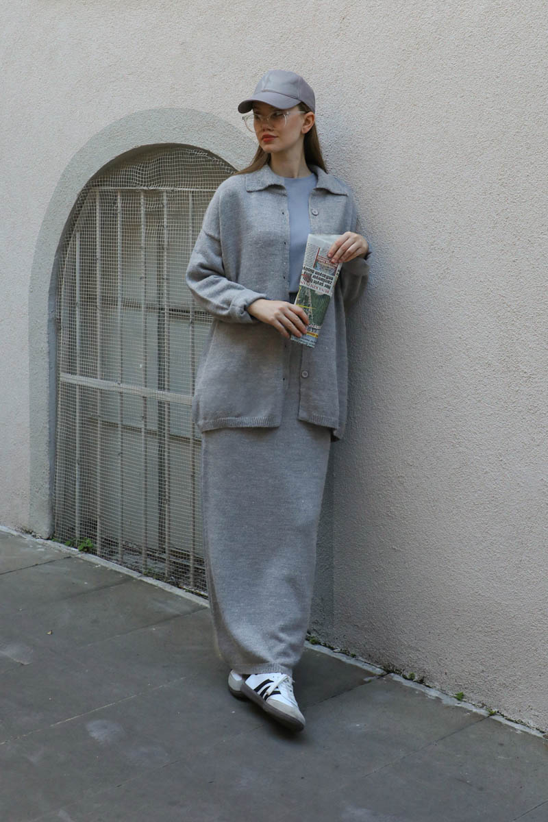Triko İkili Takım Gri. Geniş yakadır, önden düğmelidir, düşük omuzludur, cepsizdir, etek belden lastiklidir, cepsizdir, astarsızdır, dar kesimdir, örme kumaştır iç göstermez. Günlük kullanım ve özel günlerinizde tercih edebilirsiniz.