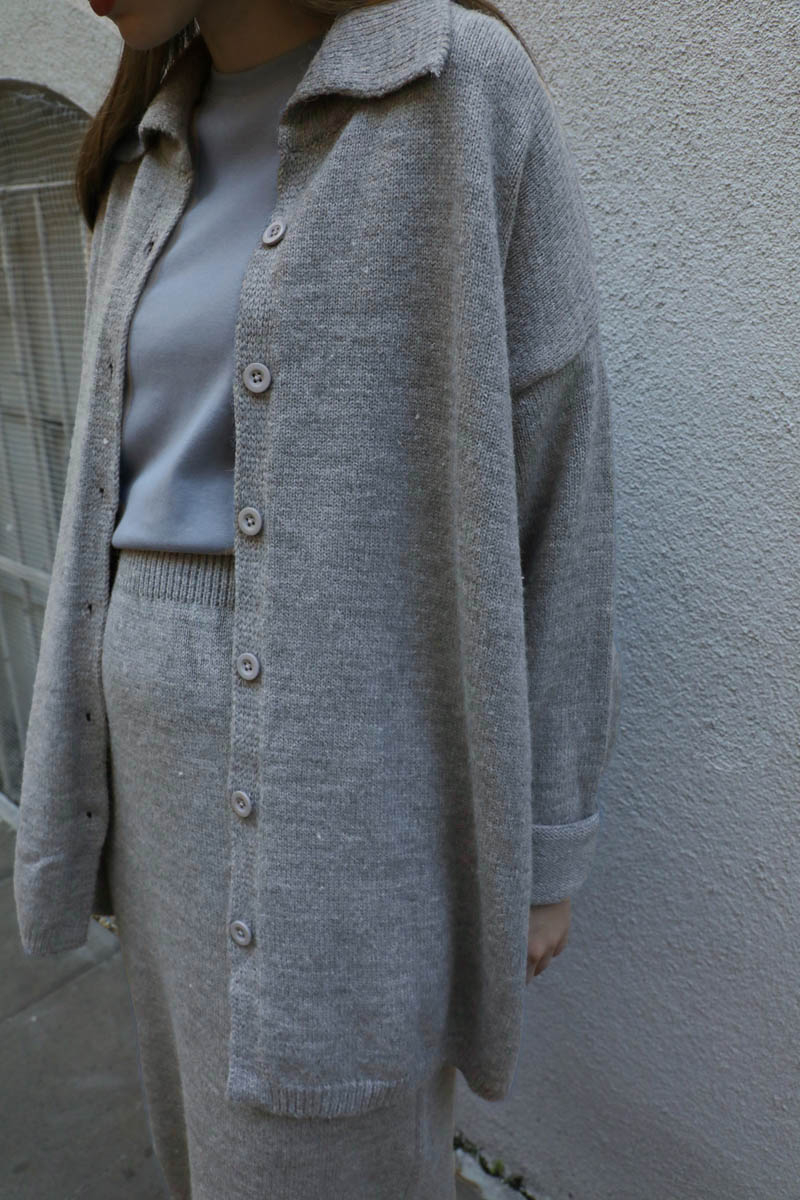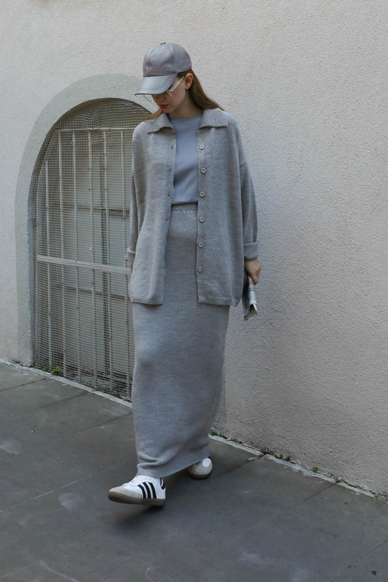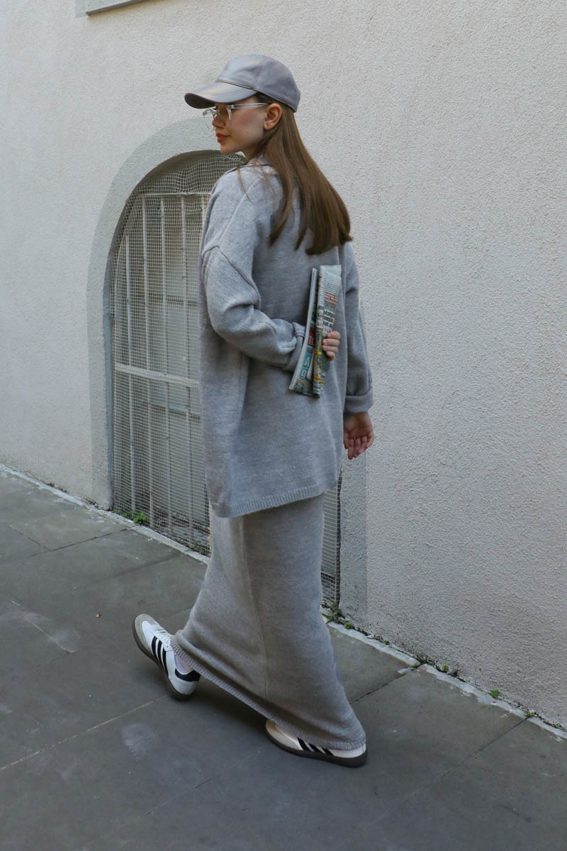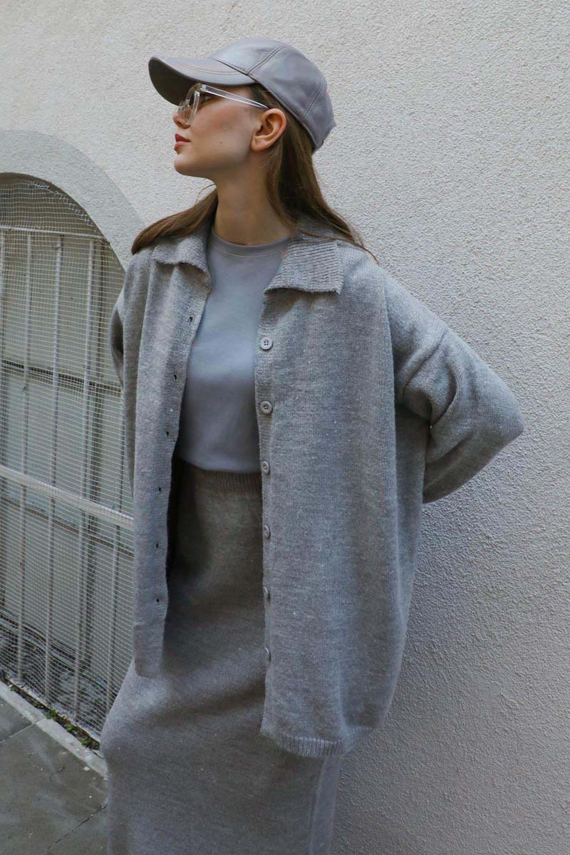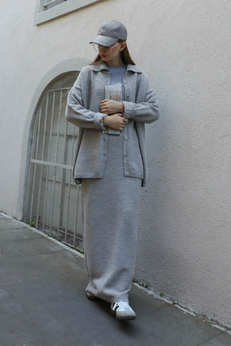 Triko İkili Takım Gri. Geniş yakadır, önden düğmelidir, düşük omuzludur, cepsizdir, etek belden lastiklidir, cepsizdir, astarsızdır, dar kesimdir, örme kumaştır iç göstermez. Günlük kullanım ve özel günlerinizde tercih edebilirsiniz.