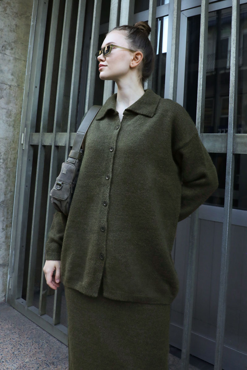 Triko İkili Takım Haki. Geniş yakadır, önden düğmelidir, düşük omuzludur, cepsizdir, etek belden lastiklidir, cepsizdir, astarsızdır, dar kesimdir, örme kumaştır iç göstermez. Günlük kullanım ve özel günlerinizde tercih edebilirsiniz.