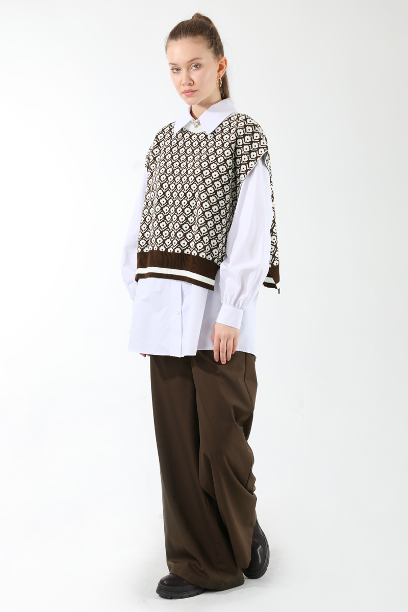 Triko Yelekli Tunik Takım Kahverengi. Triko yelek yandan bağlamalıdır. Gömlek düğmelidir. Gömlek manşeti büzgü detaylıdır. Pantolon beli lastiklidir, önden fermuarlıdır. Pantolon bol paçadır. Günlük kullanım ve özel günlerinizde tercih edebilirsiniz.